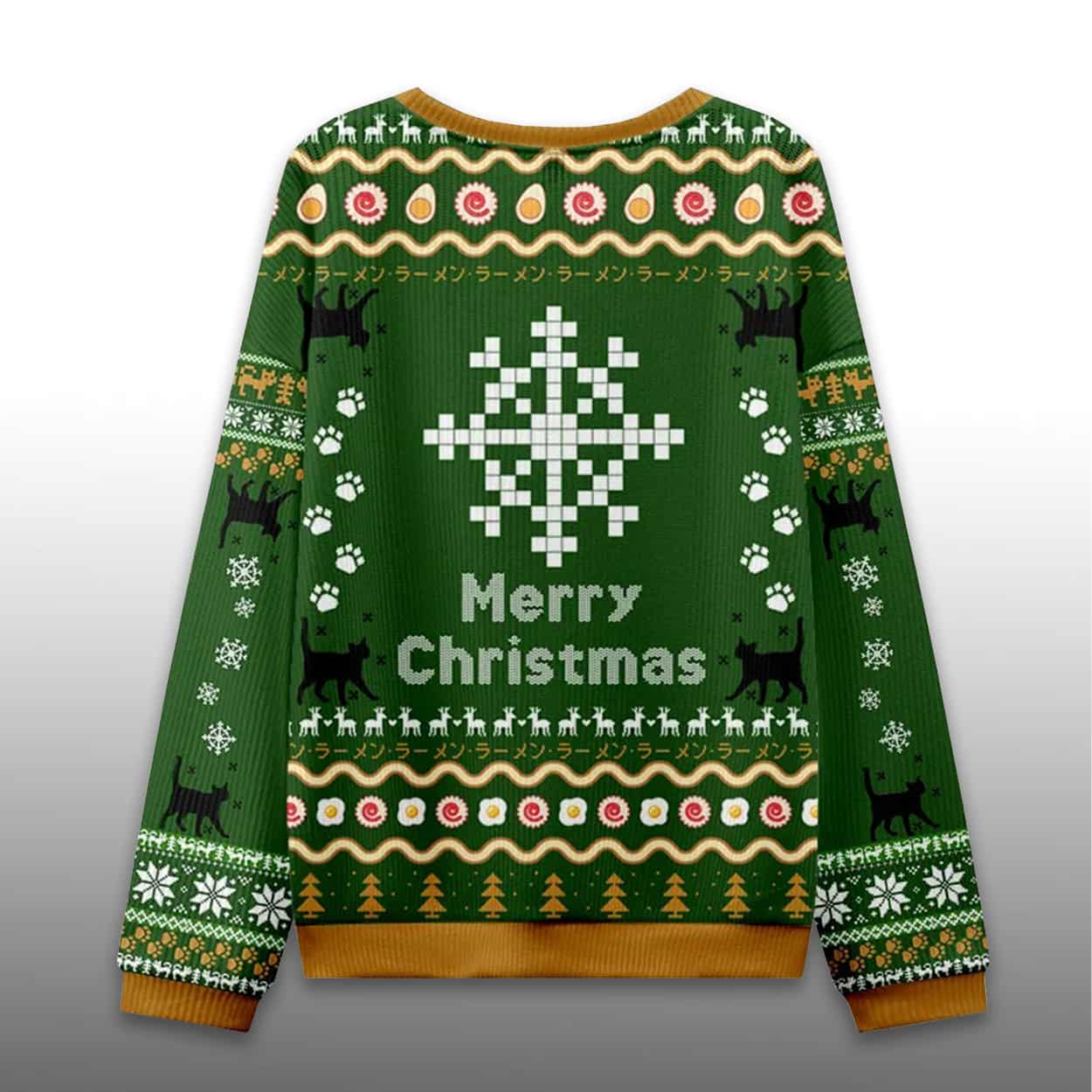 Get festive with this All I Want for Christmas Is Ramen Cat Ugly Christmas Sweater. This green pullover features a large black cat in a Japanese art style, eating ramen from a koi fish bowl. Surrounded by holiday patterns and Japanese writing, it’s the perfect, cozy, and funny sweater for any cat lover or ramen enthusiast.