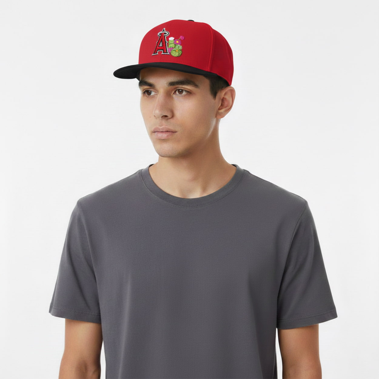 This hat is a vibrant celebration of baseball spirit and creative design. The front features the iconic red “A” crowned with a silver halo, outlined in crisp white and black for maximum impact. Adding a playful twist, a cactus blooms beside the logo with pink and yellow flowers, bringing a splash of desert charm to the classic team look. The bold red and black color scheme ensures this cap is instantly recognizable, while the unique embroidered details make it a standout accessory for any fan.