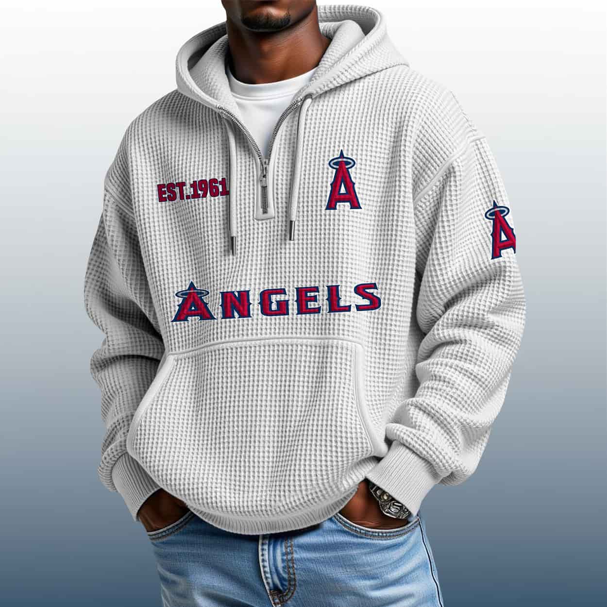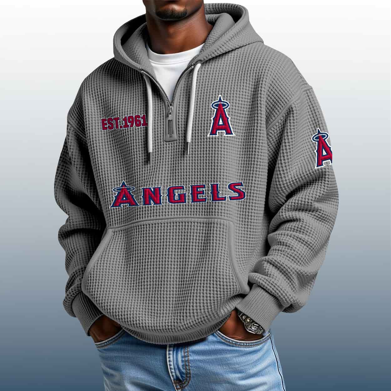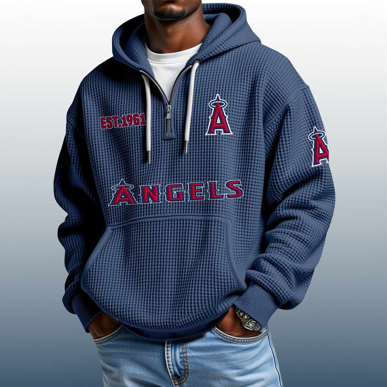 Step up your fan gear game with the Angels Est 1961 Quarter Zip Waffle Hoodie—a bold tribute to baseball legacy and West Coast swagger.