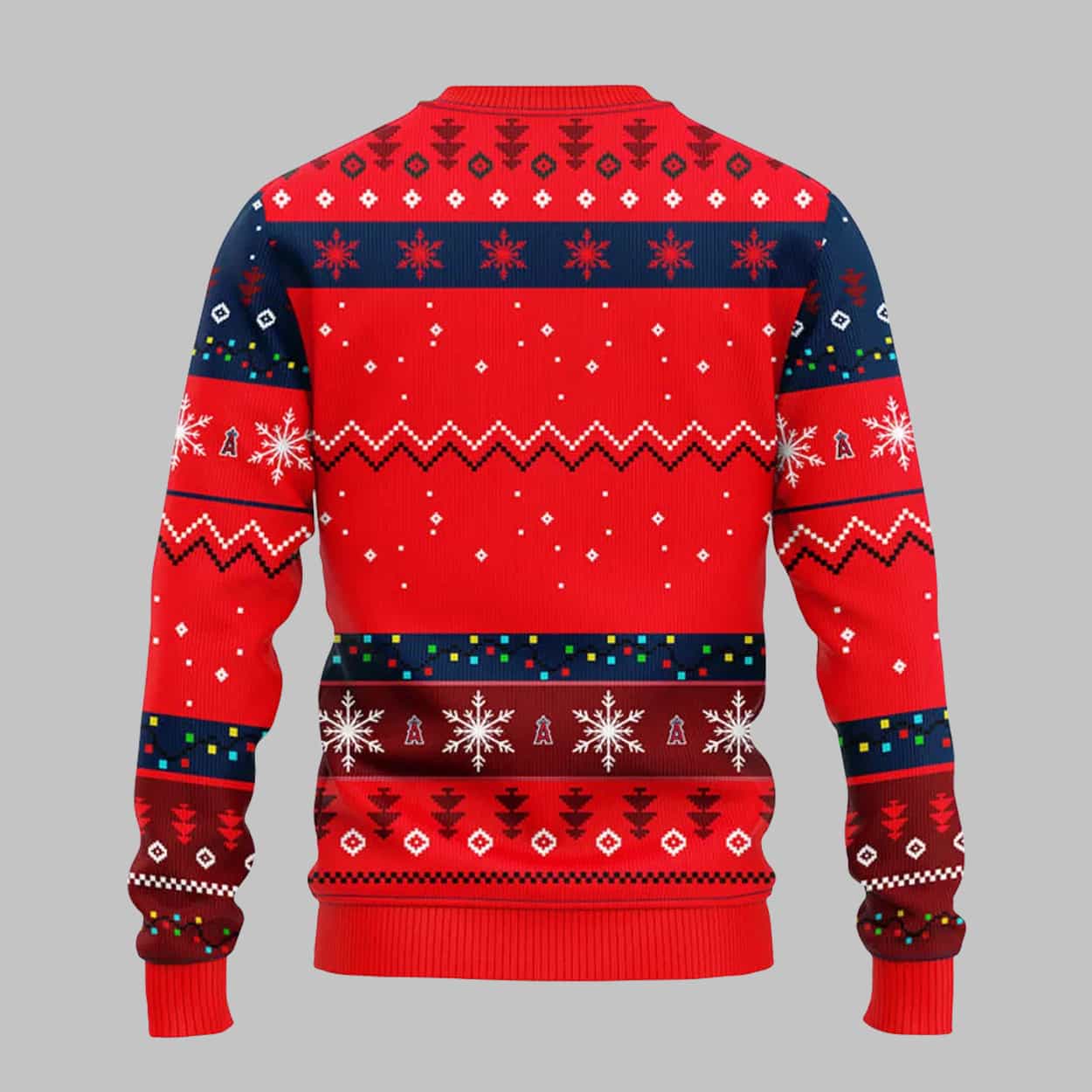 This celebratory garment uniquely blends two iconic brands: Angels baseball and Mickey Mouse. The core of the design is the stacked “Ho Ho Ho” text, where each letter integrates a Mickey Mouse head with festive elements like reindeer antlers, a Santa hat, and the Angels’ “A” logo. The sweater uses the Angels’ signature red and navy blue colors in a traditional “ugly sweater” pattern, including geometric shapes, snowflakes, and festive lights.