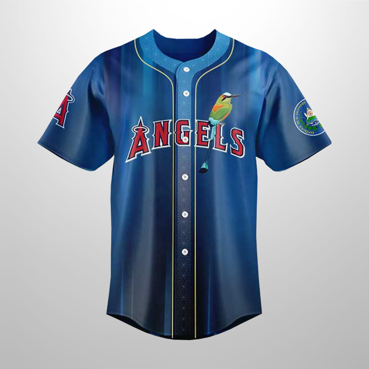 This isn’t your average “day at the ballpark” attire. This jersey drapes the classic Angels aesthetic in a stunning gradient of Pacific blues and deep navies. On the front, the legendary “Angels” wordmark gets a colorful visitor: the Torogoz, El Salvador’s national bird, perched playfully on the lettering. With its vibrant turquoise and orange plumage, this little bird is ready to fly from the outfield straight to the festivities.