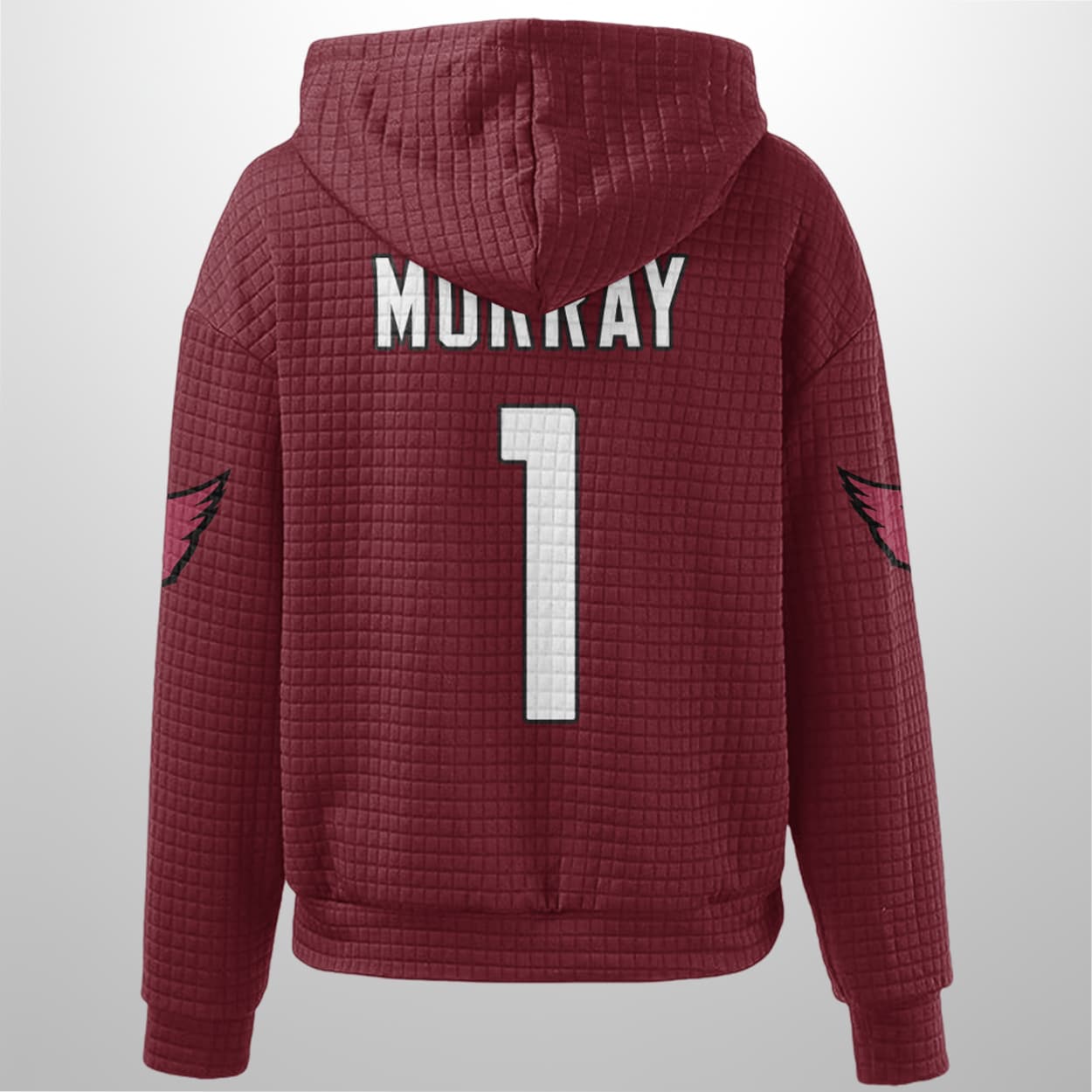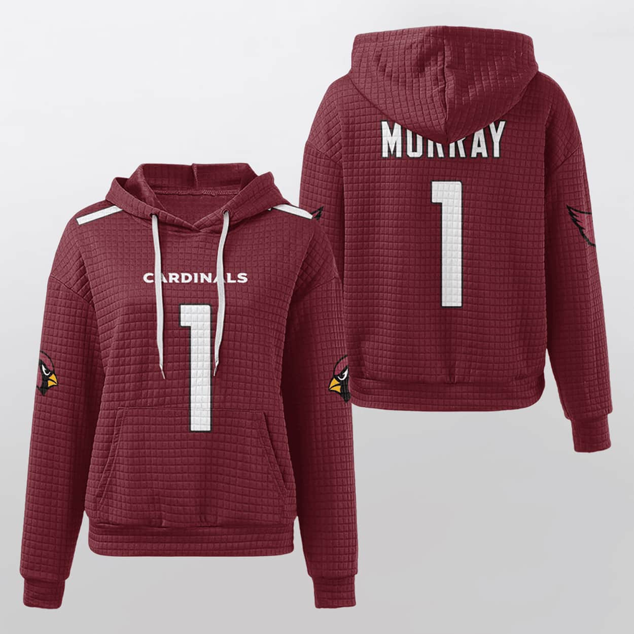 This hoodie isn’t just cozy—it’s a full-on celebration of quarterback greatness. Drenched in deep maroon with a textured waffle-knit finish, it features “CARDINALS” boldly stamped across the chest in crisp white, with the number “1” sitting proudly below. Flip it around and you’ll find “MURRAY” printed above the same iconic number, making it clear who you’re backing. With a drawstring hood, kangaroo pocket, and team logos on both sleeves, this hoodie is built for fans who live and breathe football.