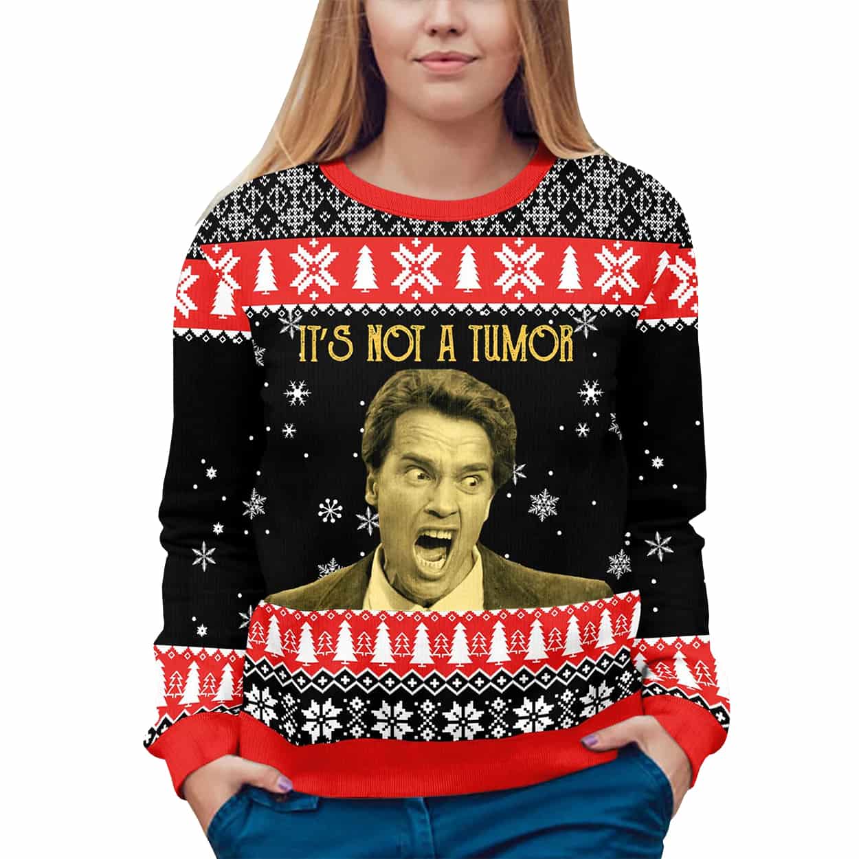 This sweater isn’t just clothing—it’s a tribute to one of the most quotable moments in ‘90s cinema. Schwarzenegger’s comedic timing and unforgettable delivery made “It’s not a tumor!” a line for the ages. Now, it’s immortalized in holiday fashion for fans who love their nostalgia served with a side of sass. Whether you’re a movie buff, meme lover, or just someone who enjoys standing out, this sweater speaks your language.