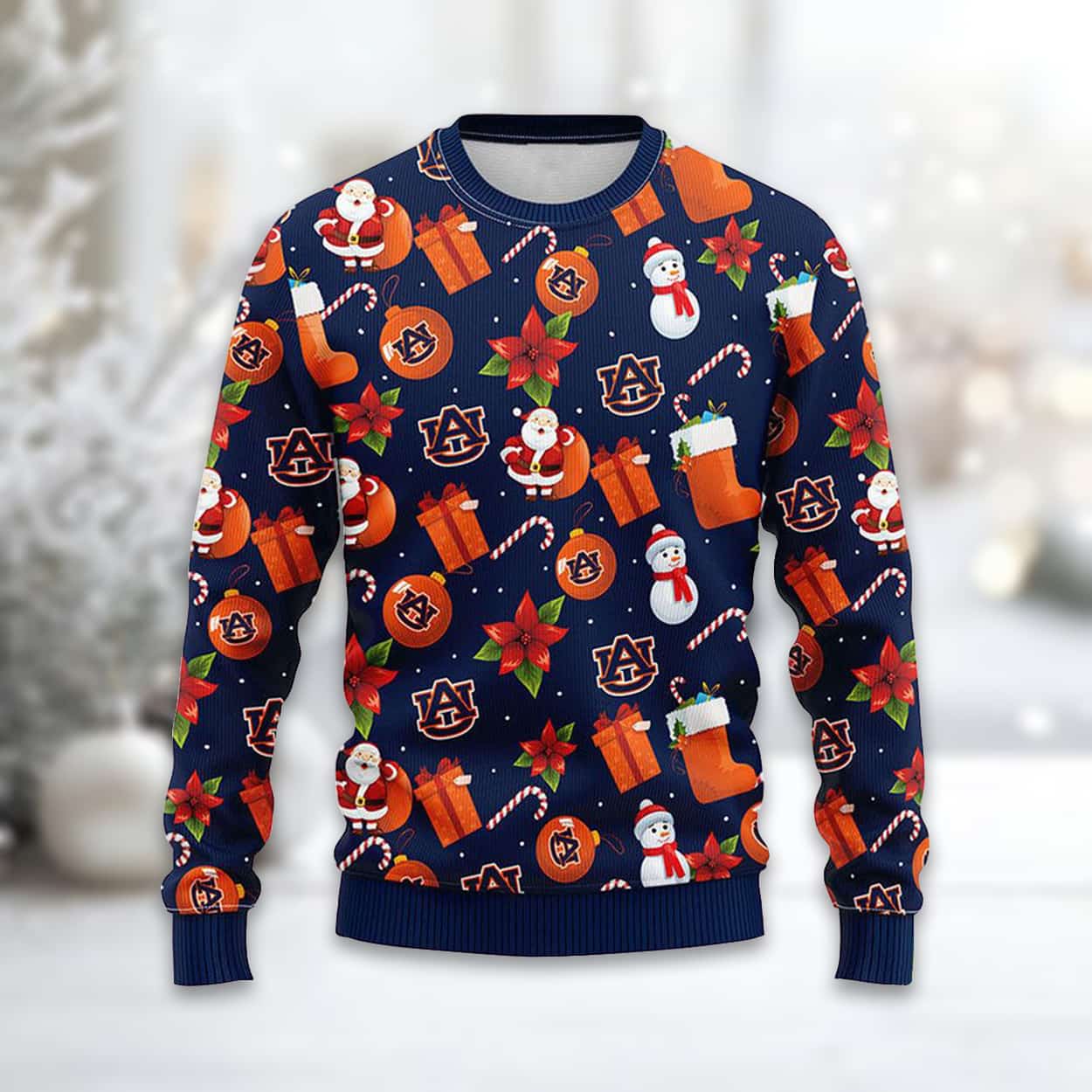 This Auburn Santa Claus Snowman Ugly Christmas Sweater features a vibrant all-over print design, merging Christmas imagery with Auburn Tigers branding. The pattern includes the Auburn ‘A’ logo, Santa Claus, snowmen, and gifts, all in the team’s signature navy and orange/red colors. This thematic pattern captures the lighthearted fun of classic “ugly sweater” style.