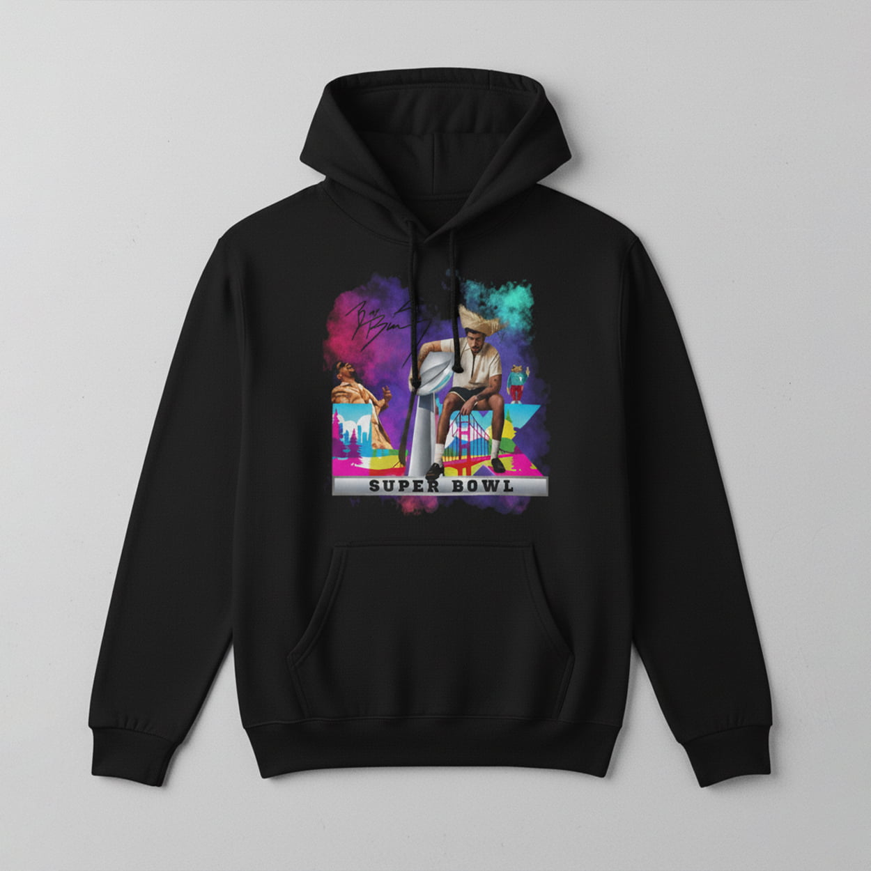 Step into the spotlight with the Bad Bunny Halftime Show 2026 Shirt—a visual explosion of rhythm, rebellion, and reggaetón royalty. The front design features a majestic figure seated on a throne, dressed in flowing white robes and a turban, channeling a modern-day mystic-meets-urban-legend vibe. Surrounding him are vibrant bursts of color: candy-cloud swirls, and surreal cityscapes that echo the energy of a stadium roaring with fans. Above it all, the signature “Big Ben” adds a cryptic twist.