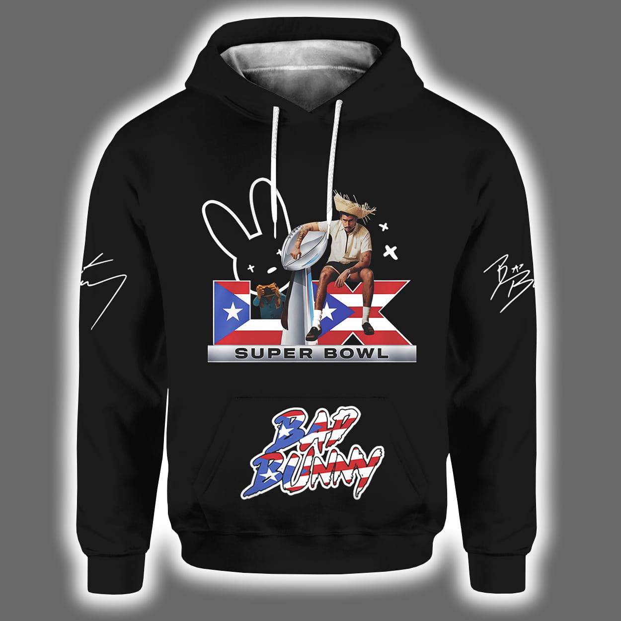 Step into the spotlight with this hoodie, a bold fusion of sports spectacle and Latin pop royalty. The front graphic features a silver football trophy—clearly inspired by the Vince Lombardi Trophy—cradled by a chill figure who’s unmistakably channeling Bad Bunny’s vibe. Behind him, the “LIX” bursts with stars and stripes, giving a patriotic nod to the Super Bowl stage. Below, “SUPER BOWL” anchors the design, while the vibrant “Bad Bunny” text near the hem adds a splash of rebellious flair. Peace signs and stylized graphics on the sleeves complete the look with playful swagger.