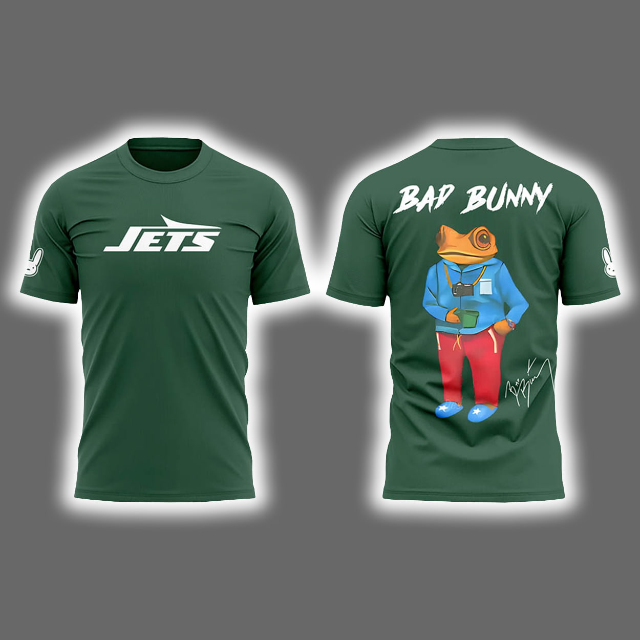 This shirt is a touchdown in style and attitude. The front features the bold “JETS” logo in crisp white, making your team loyalty unmistakable. A sleek jet-inspired graphic on the sleeve adds a subtle nod to speed and edge. But the real magic happens on the back—“BAD BUNNY” blazes across the top, and just below, a frog character steals the spotlight. Dressed in a blue hoodie, red pants, and blue sneakers, he’s rocking a camera around his neck like he’s ready to capture the moment—or be the moment. A signature-style graphic near the bottom seals the look with flair.