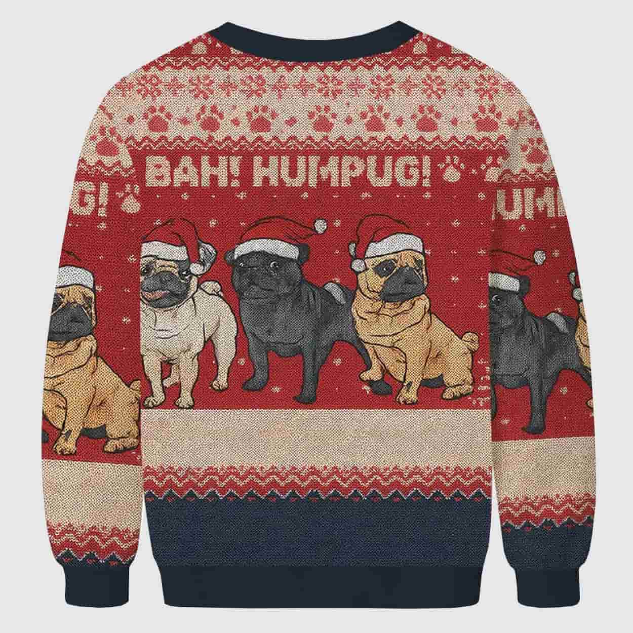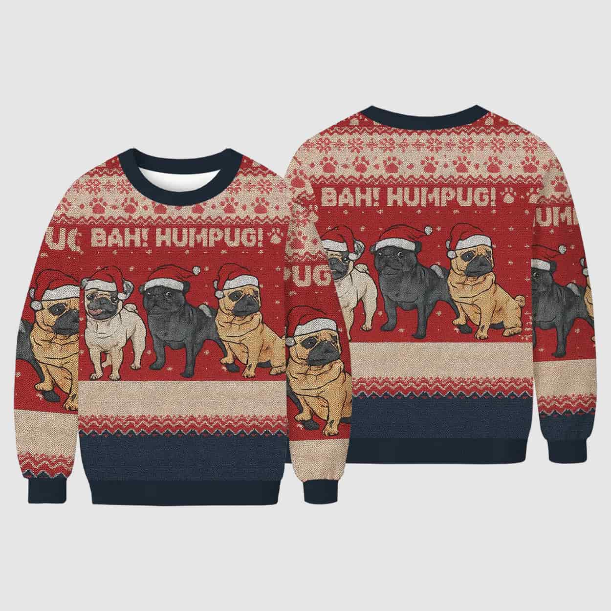 Celebrate the holidays with sass and snuggles in the Bah Hum Pug Dog Lovers Ugly Christmas Sweater — a cheeky twist on festive fashion for dog lovers and pun enthusiasts alike.