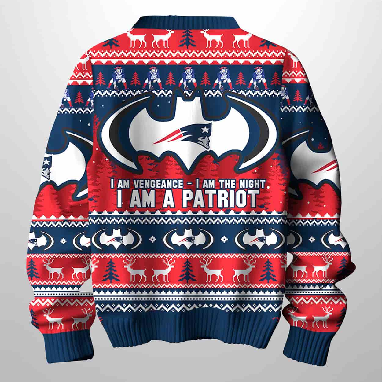 This isn’t your average ugly Christmas sweater — it’s a bold declaration wrapped in red, white, and blue. The front features a stylized Patriots head logo surrounded by classic holiday motifs like snowflakes, reindeer, and footballs. But the real showstopper is the back: a Batman-inspired emblem fused with the Patriots logo, paired with the powerful mantra, “I AM DEMOCRACY. I AM THE NIGHT. I AM A PATRIOT.” It’s festive, it’s fierce, and it’s unapologetically awesome.
