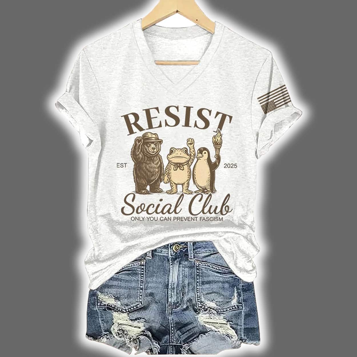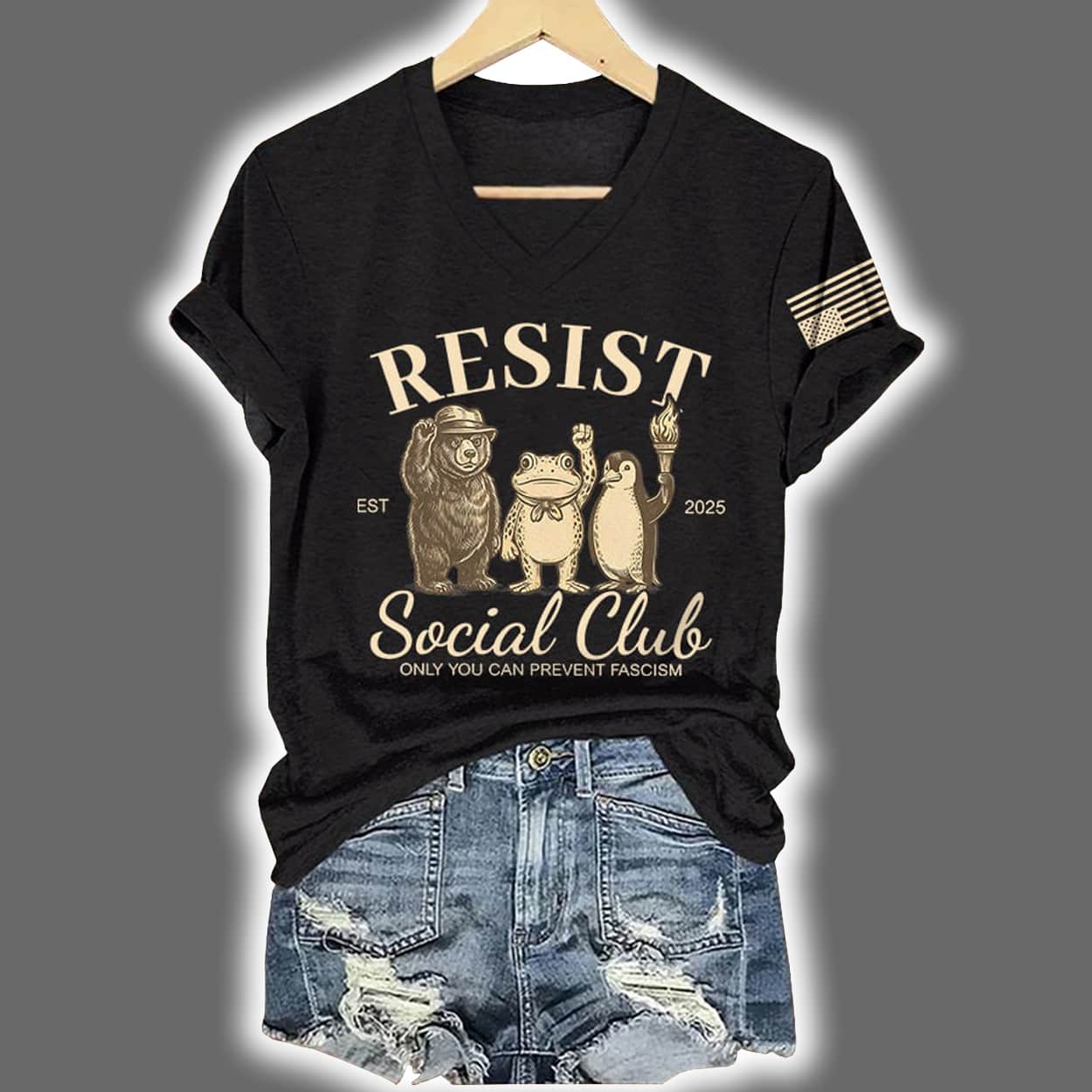 This isn’t your average graphic tee—it’s a conversation starter. This shirt showcases a vibrant print of three anthropomorphic animals—a bear, a frog, and a penguin—each raising a paw, flipper, or webbed hand in solidarity. Above them, the word “RESIST” shouts in bold capital letters, while below, “Social Club” is elegantly scripted, followed by the rallying cry: “ONLY YOU CAN PREVENT FASCISM.” Flanked by “EST 2025,” the frog stands center stage, giving the design a playful yet purposeful symmetry. A small American flag on the sleeve adds a subtle nod to civic duty.