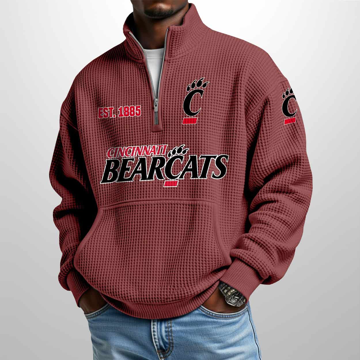 Step into timeless collegiate cool with this sweatshirt. This maroon pullover isn’t just cozy—it’s a visual celebration of University of Cincinnati pride. The textured waffle pattern adds depth and character, while the stand collar and half-zip design bring a sporty edge. Printed across the chest in bold black, white, and red lettering, “CINCINNATI BEARCATS” makes a confident statement. Above the left chest logo, “EST. 1885” nods to the university’s rich heritage, and the iconic “C” paw print logo appears twice—once on the chest and again on the sleeve—like a double high-five to Bearcat fandom.