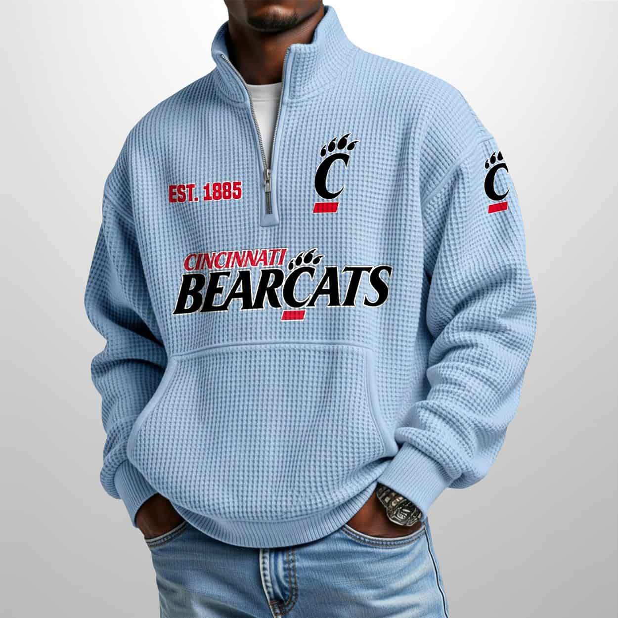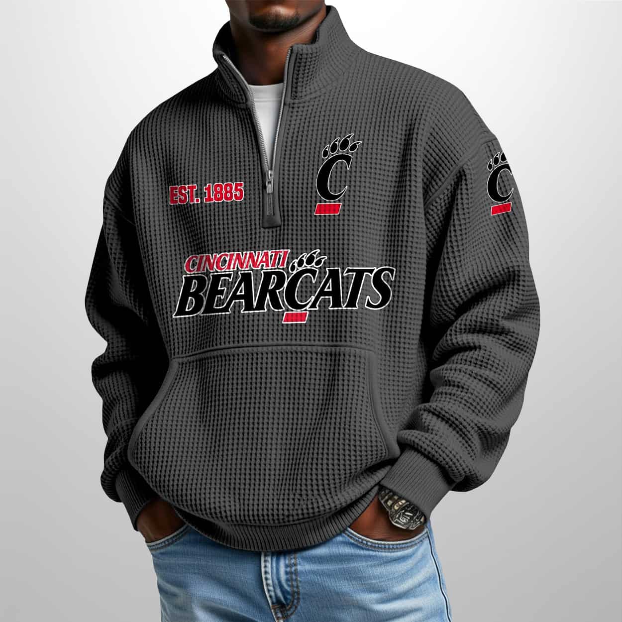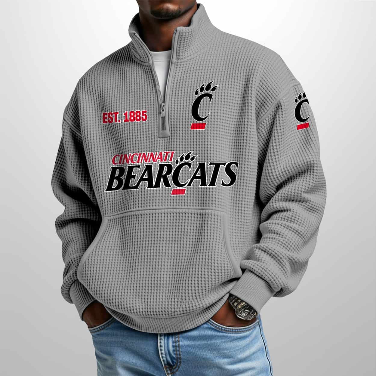 Bearcats Est 1885 Waffle Stand Collar Half Zip Sweatshirt – Where Tradition Meets Texture