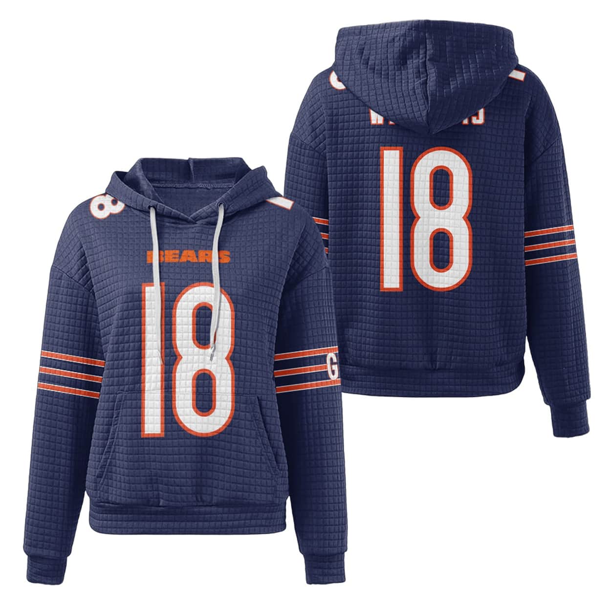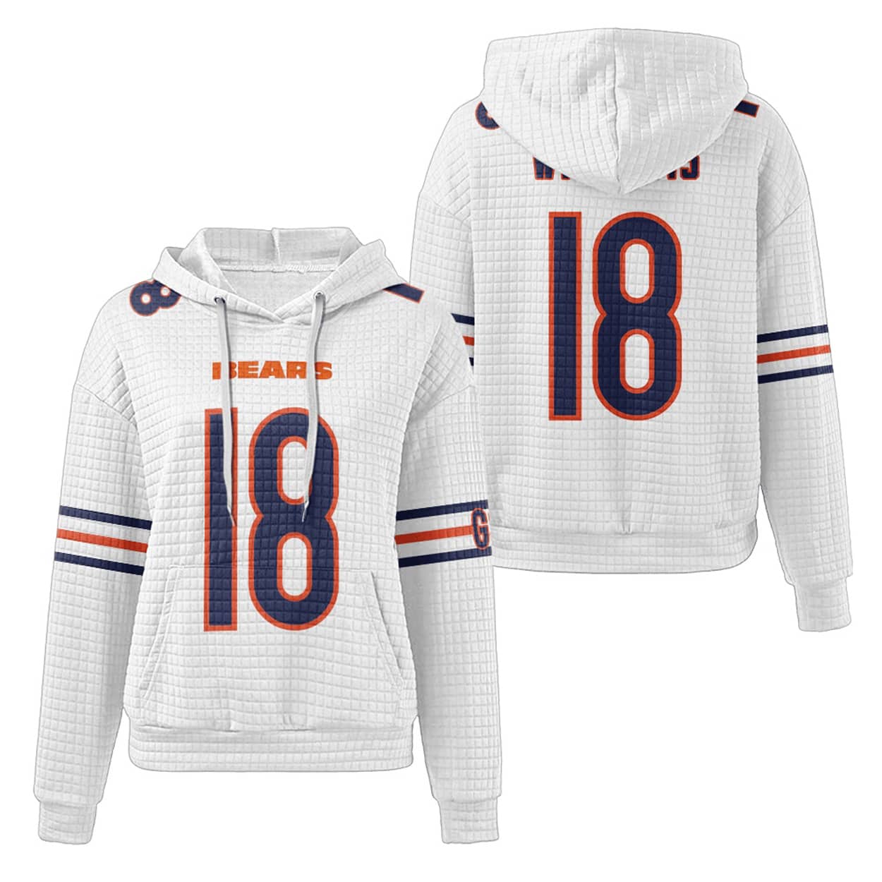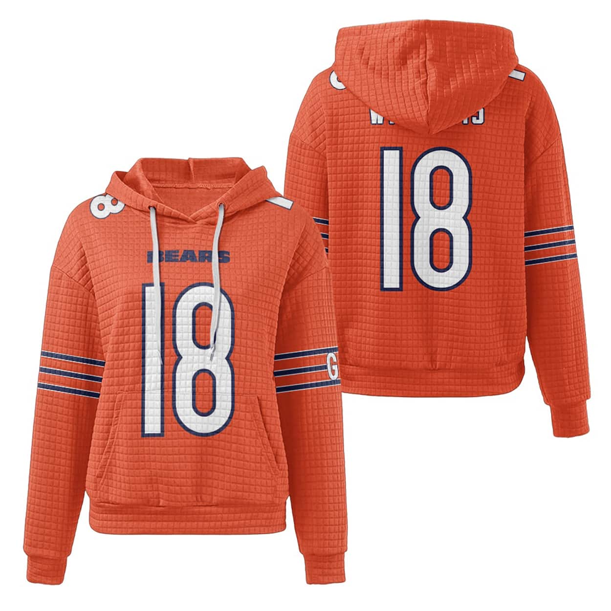 Step into the spotlight with this hoodie—a fan-favorite that screams confidence. This hoodie features oversized white-and-orange outlined “18” numerals on both the front and back, making sure everyone knows who you’re repping. Above the front number, “BEARS” pops in bold orange block letters, while the sleeves sport dynamic orange and white stripes that add a punch of energy. A textured waffle pattern gives it a unique visual edge, and the “GR” detail on the left sleeve adds a mysterious flair that invites conversation.
