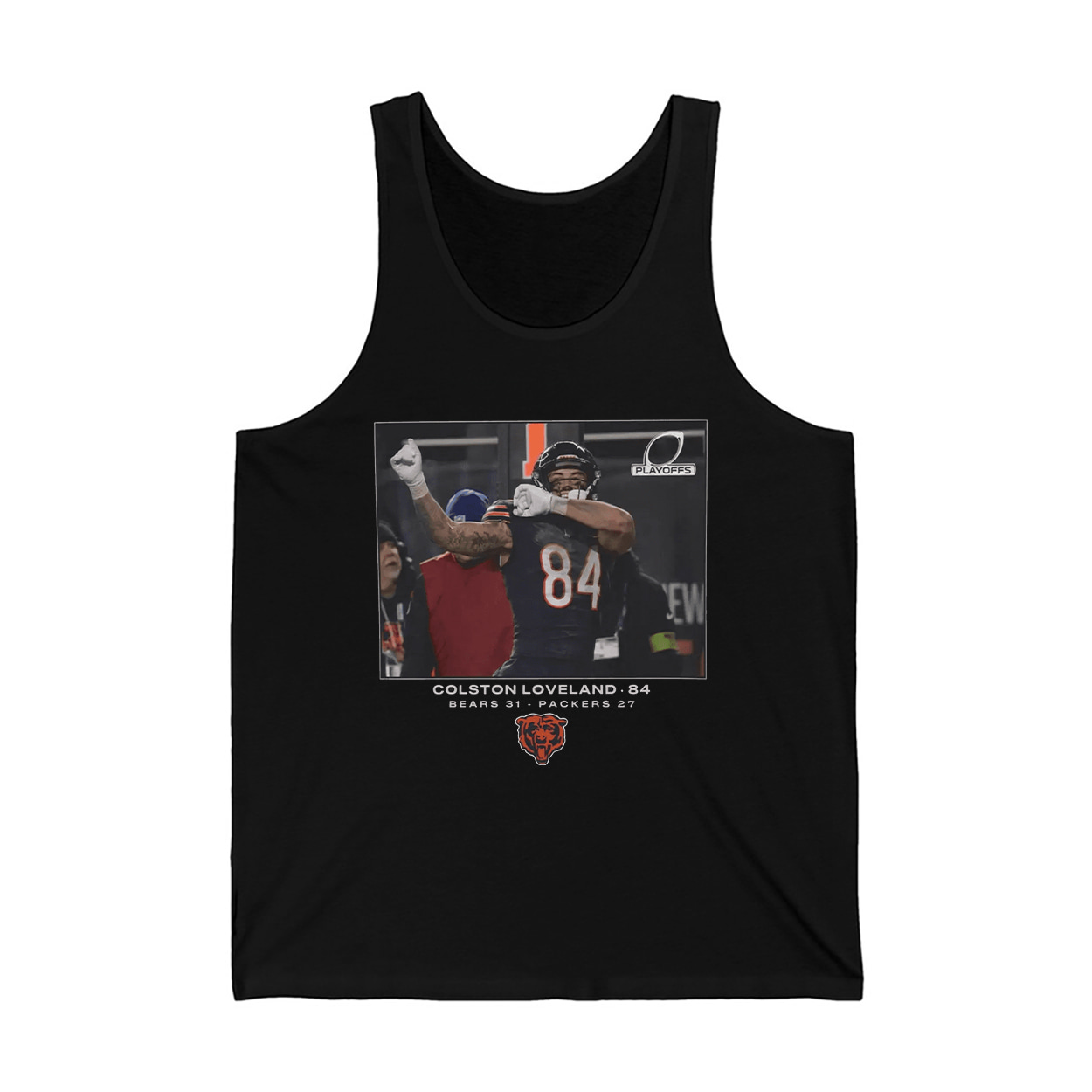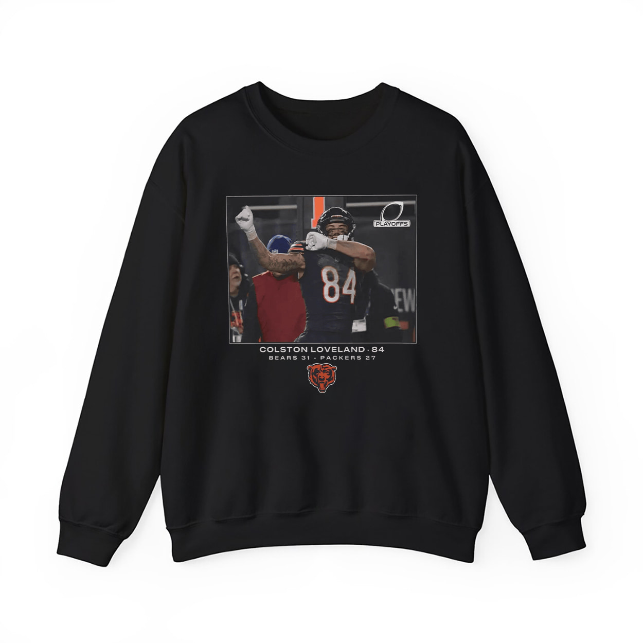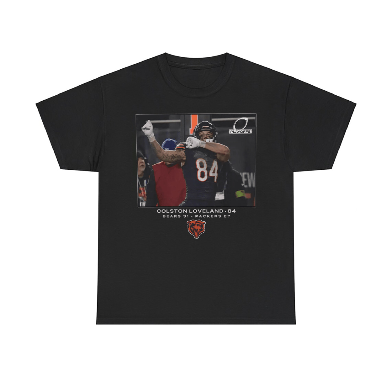 This shirt is more than fan gear—it’s a wearable highlight reel. The shirt showcases a vivid graphic of Colston Loveland mid-celebration, flexing triumphantly after a game-changing play. The scoreboard reads “BEARS 31 – PACKERS 27,” immortalizing a Wild Card victory that fans won’t soon forget.