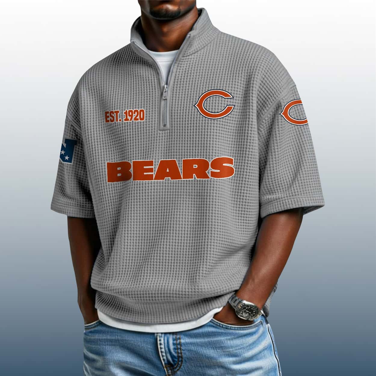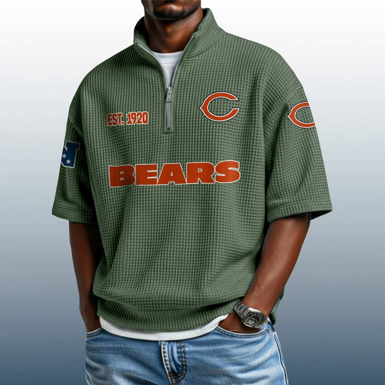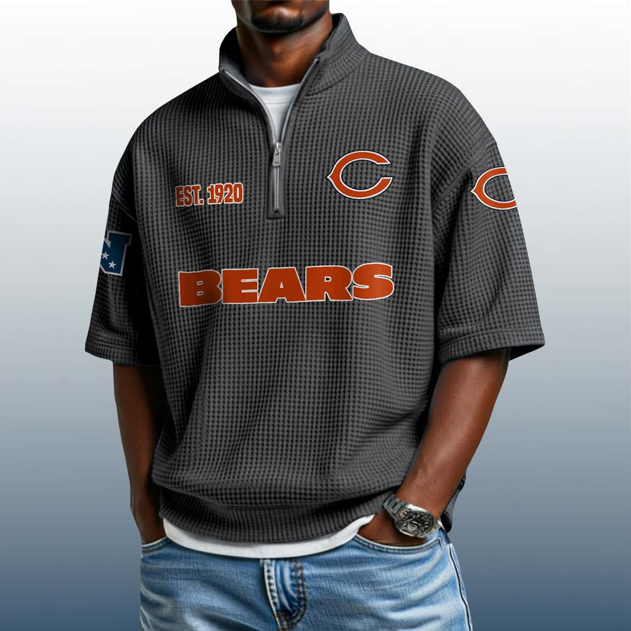 Showcase your Bears pride with the Bears Est 1920 Waffle Stand Collar Half Zip Polo Shirt. A unique blend of vintage sports aesthetics and modern streetwear, perfect for fans who demand style and comfort.