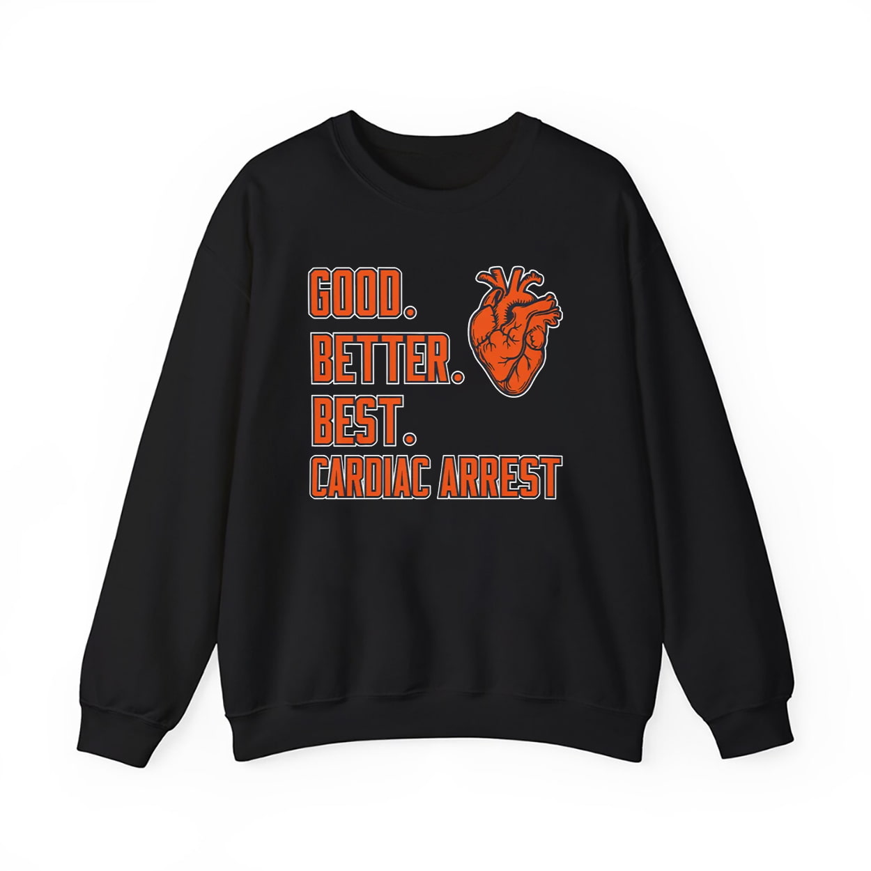 This isn’t your average graphic tee. This shirt delivers a punch of dark humor and visual intensity. Set against a sleek black backdrop, the shirt features a striking anatomical heart in fiery red and orange tones, pulsing with energy. Beside it, bold block lettering marches through the familiar motivational mantra—“GOOD. BETTER. BEST.”—before abruptly landing on “CARDIAC ARREST.” It’s a jolt of irony that flips the script and demands a double take.