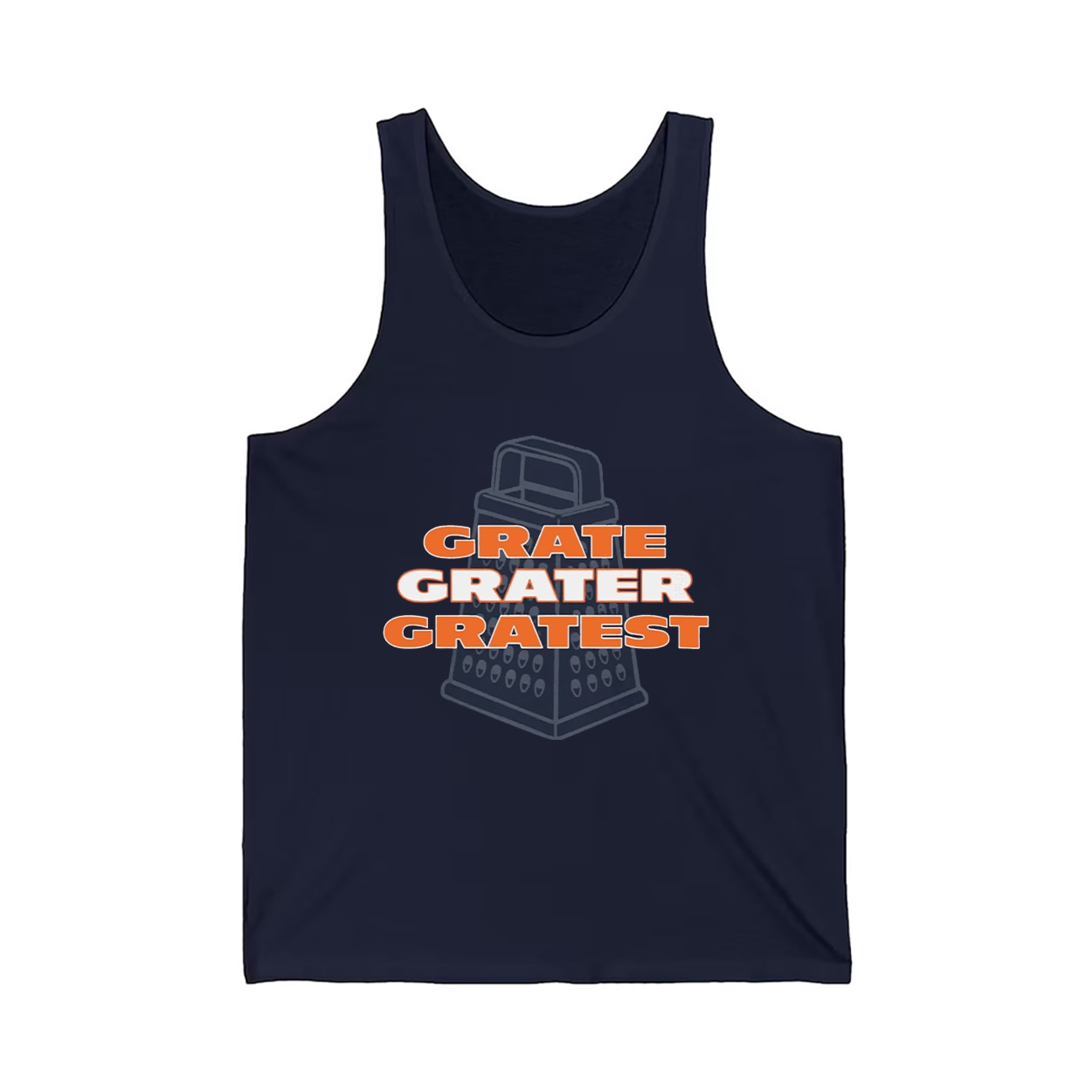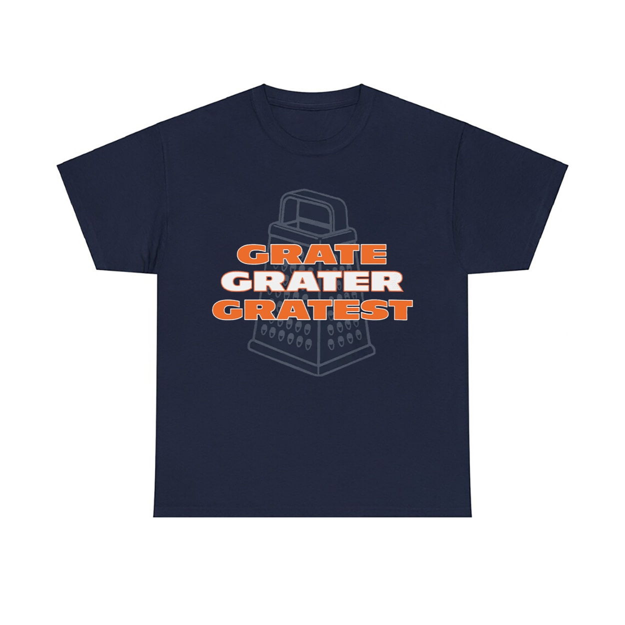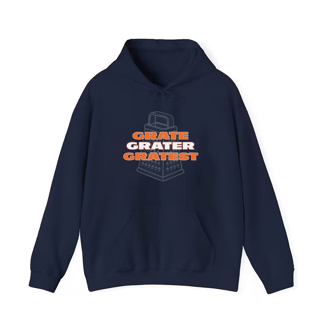 Bears fans know that supporting their team is about more than wins and losses—it’s about belief, tradition, and optimism. This shirt captures that energy with a playful pun that doubles as a quiet flex. “Grate. Grater. Gratest.” becomes a layered message: a wink to those who appreciate clever design, and a rallying cry for those who see Chicago football as a way of life. It’s witty, it’s bold, and it’s unmistakably Bears.