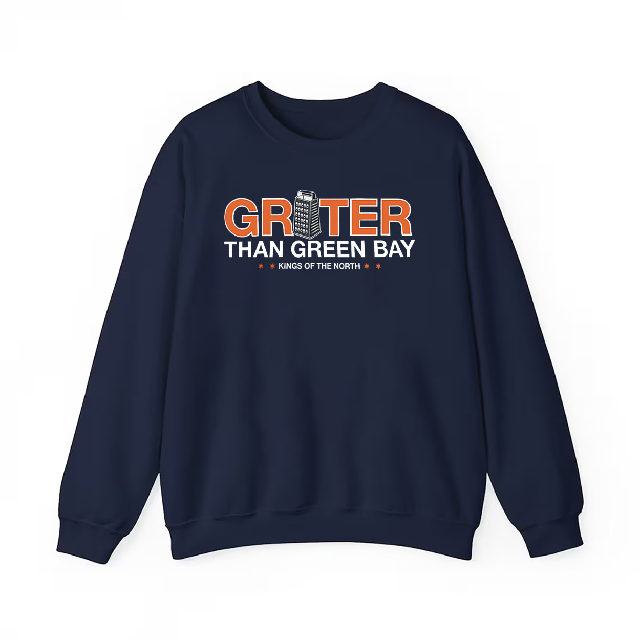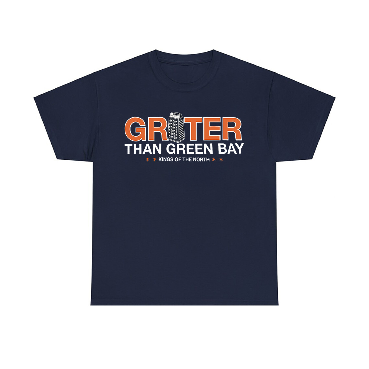 This shirt is the ultimate wardrobe essential for fans who know exactly where the power lies. The design centers on a brilliant play on words: “GRATER” is rendered in bold orange, with a literal metal cheese grater cleverly replacing the letter ‘A’. Directly beneath, the message is punctuated with “THAN GREEN BAY” and the definitive title “KINGS OF THE NORTH”. Flanked by four orange stars, this sharp graphic uses the team’s iconic colors to deliver a high-impact message that is as stylish as it is provocative.