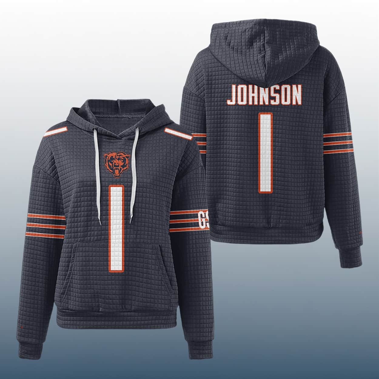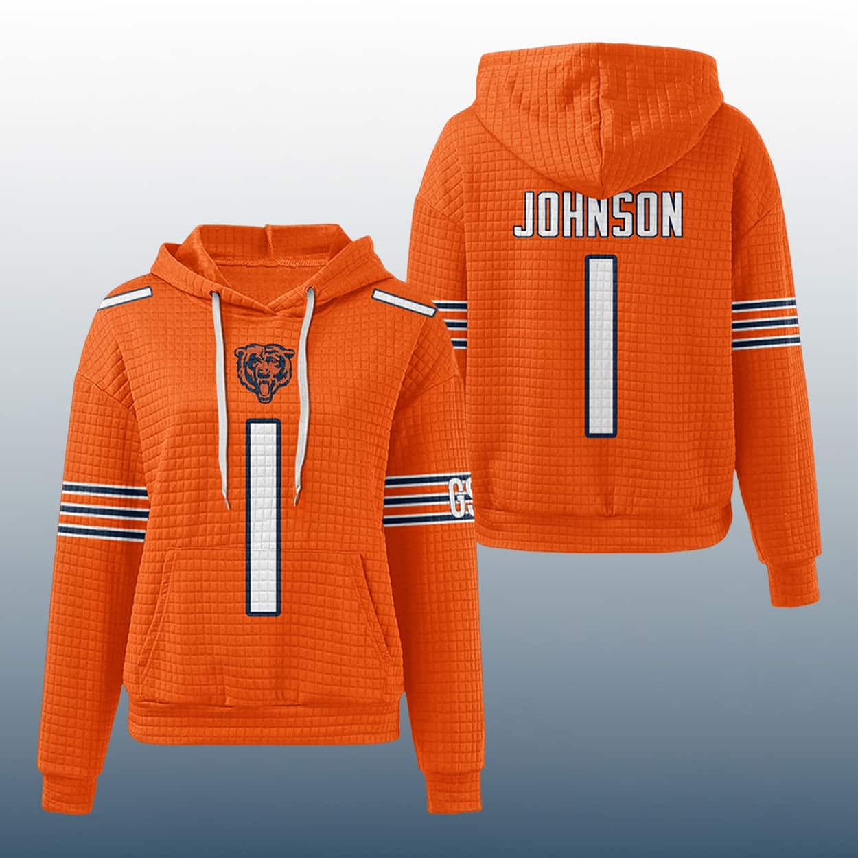 Step into the spotlight with this hoodie, a fan-favorite fusion of streetwear and football flair. This hoodie channels the energy of Soldier Field with its bold number “1” front and center in crisp white and orange. Above it, the iconic Bears logo roars with pride. The sleeves sport classic orange-and-white stripes, while the left sleeve adds a surprise twist with the “GB”—a nod to legacy and grit. Flip it around and you’ll find “JOHNSON” printed across the back, perched above the number 1 like a badge of honor.