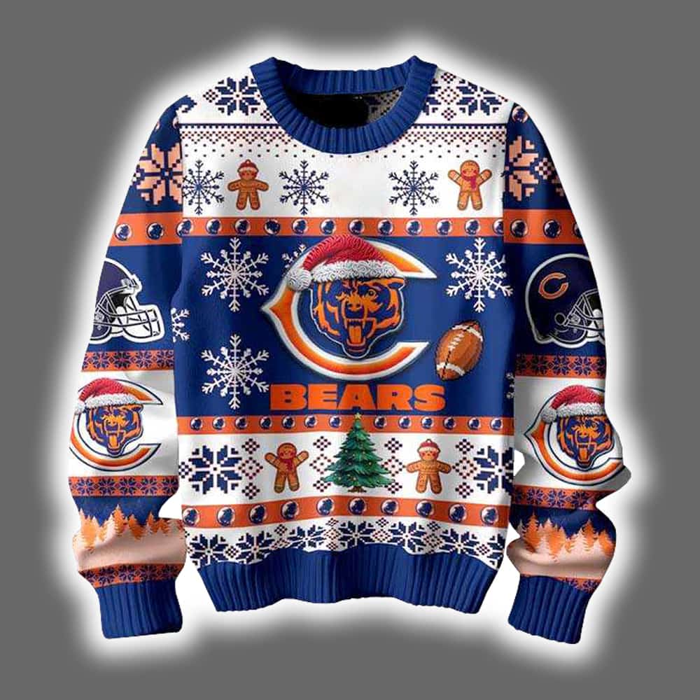 Turn heads and spark conversations at every holiday party with the Bears They Not Like Us Ugly Christmas Sweater. Drenched in deep navy blue with bursts of orange, white, and green, this sweater is a winter wonderland of Chicago Bears spirit. The front showcases the iconic Bears logo rocking a Santa hat, surrounded by snowflakes, gingerbread men, and football helmets. Flip it around and you’ll find a roaring fireplace and the cheeky phrase “BEARS FANS ARE NAUGHTY AND NICE” boldly stitched across the back—because Bears fans don’t play by the rules, they rewrite them.