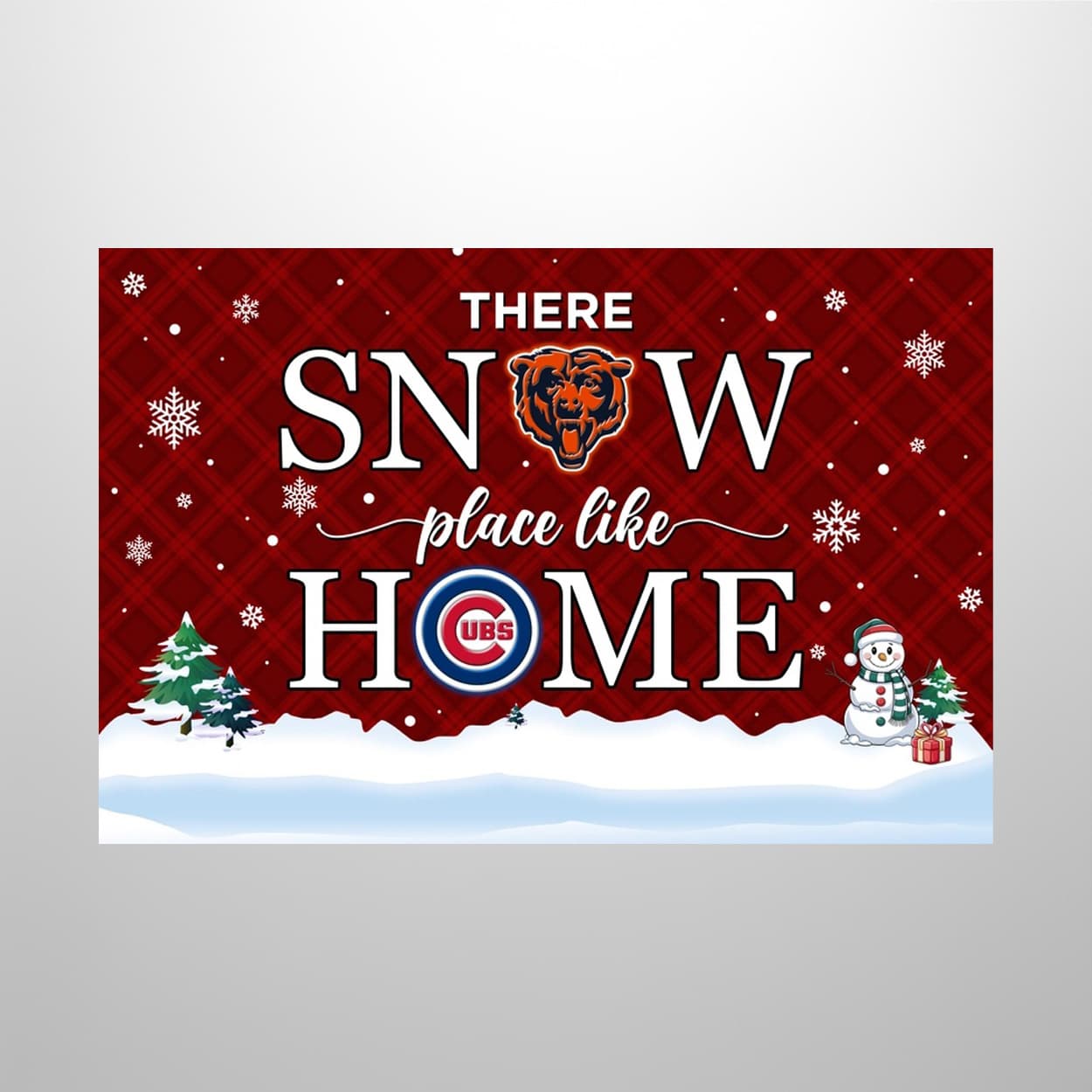 Step into the season with a doormat that’s as spirited as your fandom. This doormat features a vibrant red backdrop sprinkled with snowflakes, setting the tone for cozy winter vibes. A cheerful snowman, pine trees, and a wrapped gift add a dash of holiday charm, while the clever phrase “THERE SNOW place like HOME” steals the spotlight. The word “SNOW” swaps the “O” for the Chicago Bears logo, and “HOME” does the same with the Cubs logo — a playful twist that celebrates both teams in one snowy statement.