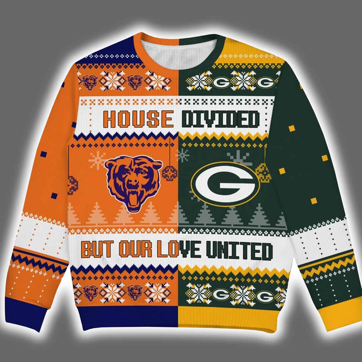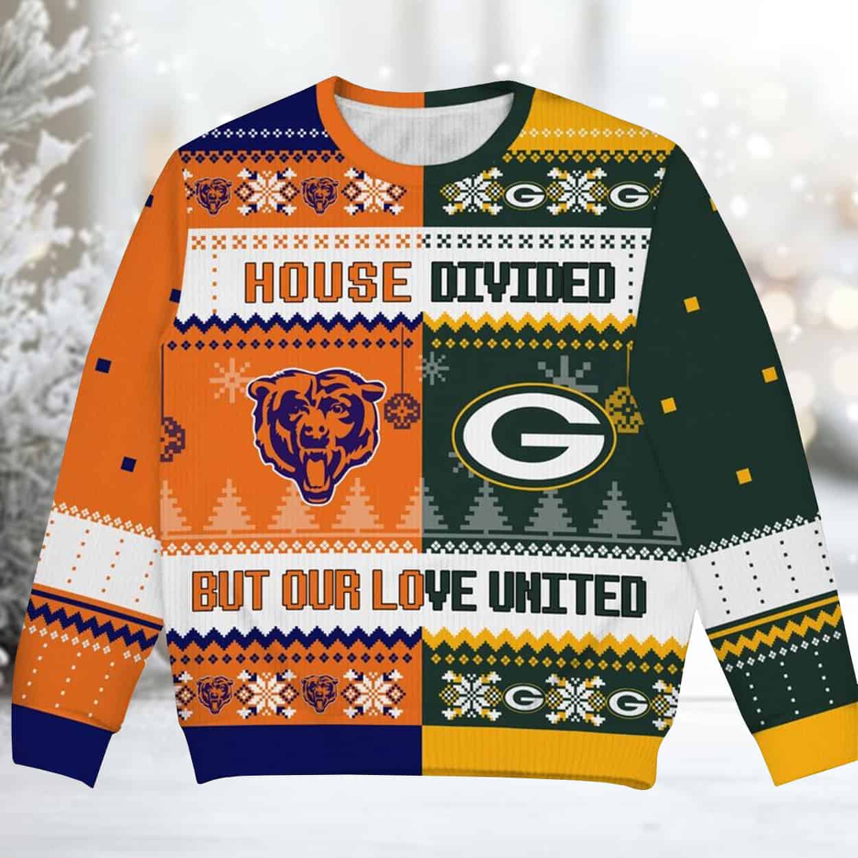 This sweater is a bold, festive fusion of two iconic legacies. On the left, the Bears roar in orange and navy blue, while the right side glows with the Packers’ signature green and gold. Each half proudly displays its team’s logo, surrounded by classic holiday motifs—snowflakes, diamonds, zigzags—that add a cheerful twist to the competitive spirit. Across the chest, “HOUSE DIVIDED” makes the rivalry clear, but the heartwarming “BUT OUR LOVE UNITED” printed along the bottom reminds everyone that love wins, even on game day.