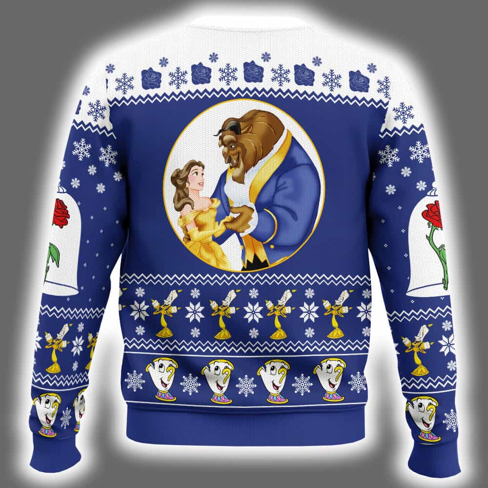 Celebrate the holidays with a magical twist in this Beauty And The Beast Ugly Christmas Sweater, featuring Belle, Beast, and your favorite enchanted friends in a festive winter wonderland.