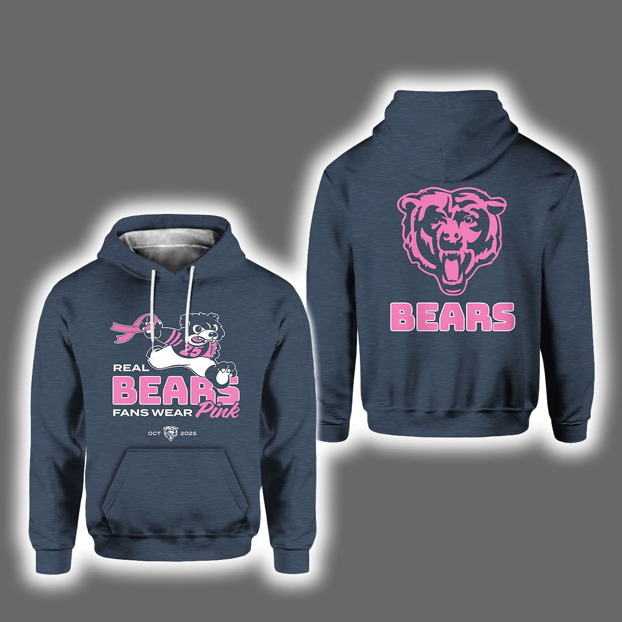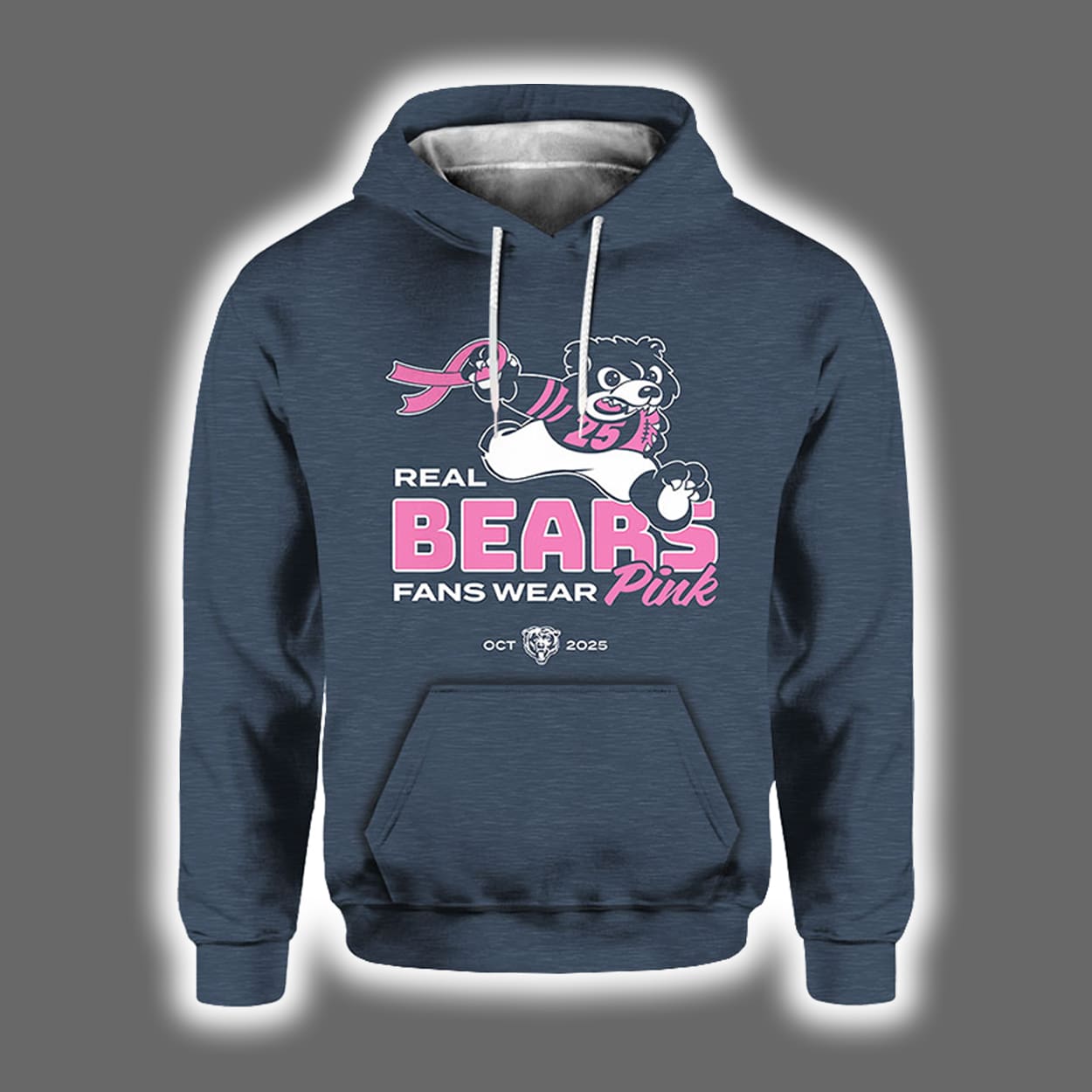 Step into October with unapologetic flair in this shirt. This navy blue hoodie is a visual touchdown, featuring a front graphic of a vibrant pink bear mascot paired with the cheeky slogan “REAL BEARS FANS WEAR Pink.” The bold white and pink lettering pops against the deep navy, while the back showcases a commanding pink bear head above the word “BEARS” in oversized block letters.