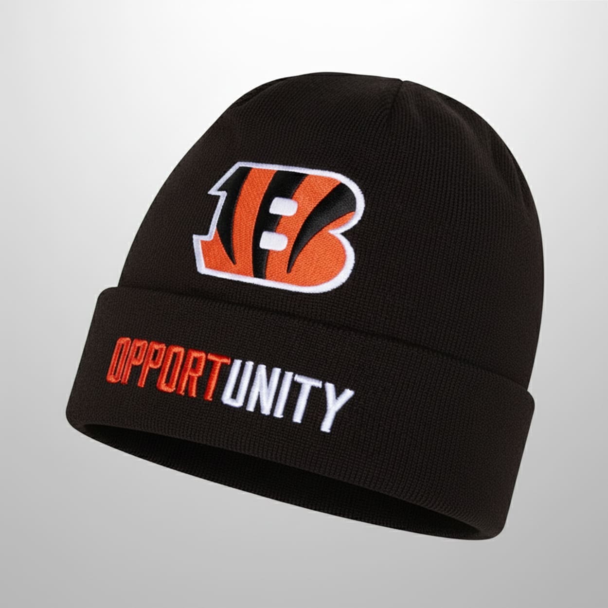 Turn heads and spark conversations with this hat. This sleek black knit beanie features the iconic Bengals logo front and center—a fierce orange-and-black striped “B” that screams team spirit. Just below, the folded brim delivers a visual punch with the word “OPPORTUNITY” embroidered in a split-tone style: “OPPORT” in fiery orange and “UNITY” in crisp white. It’s not just a hat—it’s a vibe, a rally cry, and a warm hug for your head.