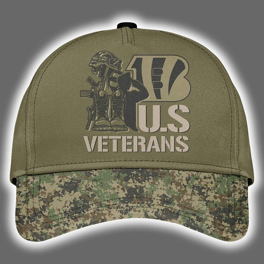 This collection is more than just merchandise; it’s a statement. The front of the hoodie features a “YOUR NAME” and “CINCINNATI” patch, allowing for a personal touch, alongside the powerful “UNITED STATES VETERAN” text and a silhouetted rifle graphic, representing the core values of service and dedication. The back of the hoodie is a work of art, with the Bengals logo boldly intertwined with the “U.S. VETERANS” text and an illustration of a soldier in uniform, symbolizing the unbreakable bond between team and country. The joggers feature a subtle Bengals logo on the hip, allowing the camouflage to make a quiet, confident statement. The cap mirrors the hoodie’s main graphic, making a powerful visual tribute. This collection is for those who appreciate the courage of our veterans and want to show their support in a unique and fashionable way.