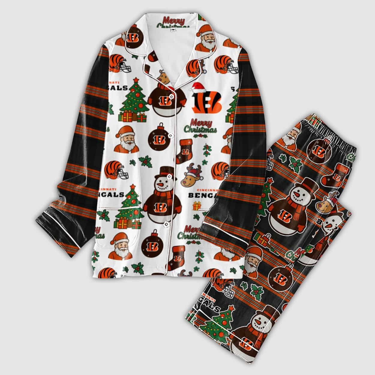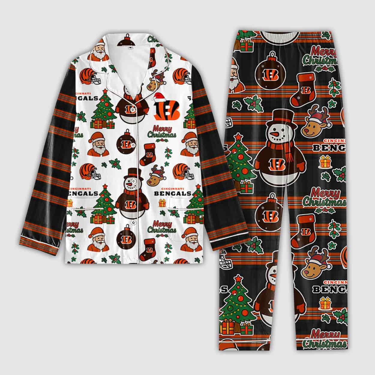Get ready to sleigh the holiday season with this pajama set — the ultimate festive gear for die-hard fans of Cincinnati’s gridiron warriors. This eye-catching ensemble decked out in playful holiday graphics: Santa Claus tossing touchdowns, snowmen wearing Bengals shirt, reindeer prancing in orange and black, and Christmas trees trimmed with team pride. The bold “Merry Christmas” and “BENGALS” text adds a spirited shoutout to your favorite team. The matching pants continue the celebration with a black base and a flurry of similar holiday-themed illustrations, making this set a full-body tribute to football and festivities.