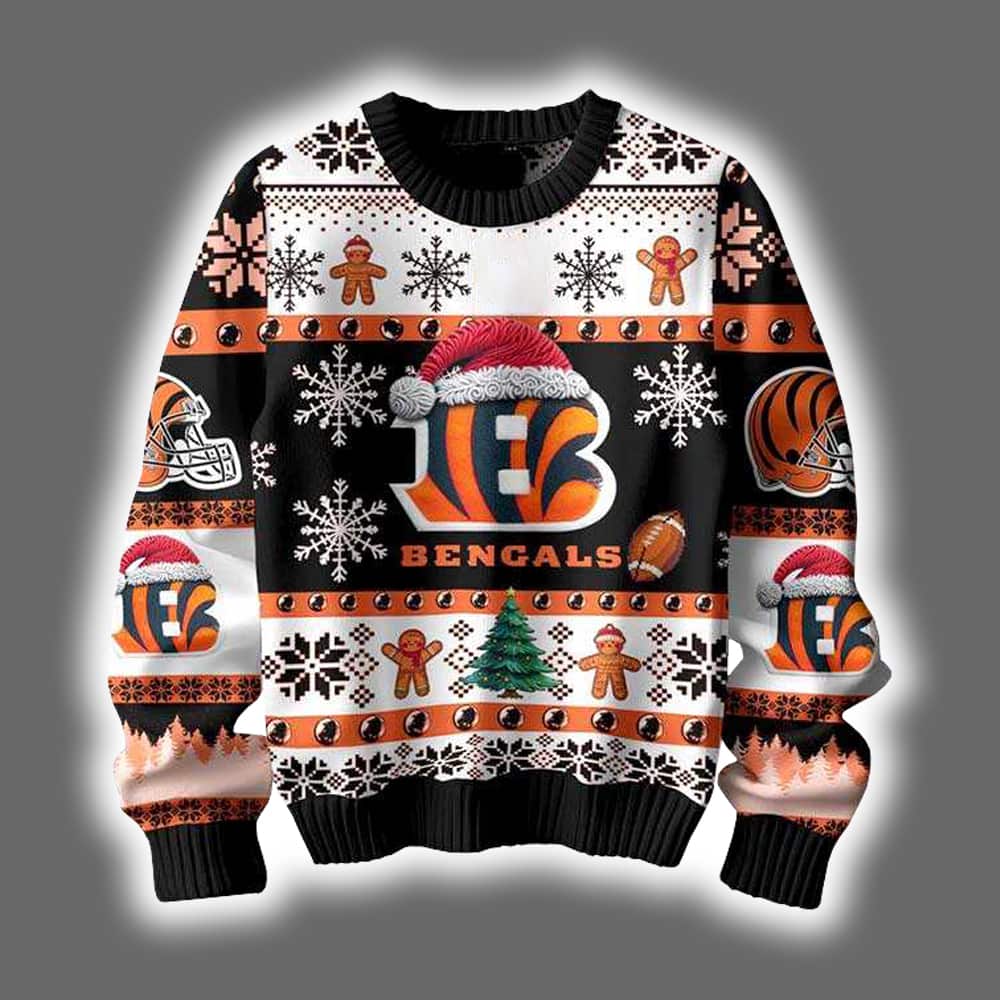 Deck the halls and dominate the tailgate with the Bengals They Not Like Us Ugly Christmas Sweater. This eye-catching piece blends classic holiday charm—think snowflakes, gingerbread men, and Santa hats—with the unmistakable roar of Cincinnati football. The front proudly showcases the Bengals logo topped with a Santa hat, while the back delivers the ultimate wish list: “ALL I WANT FOR CHRISTMAS IS A BENGALS WIN.” With bold orange, black, and white accents, this sweater turns every gathering into a celebration of team spirit and seasonal swagger.