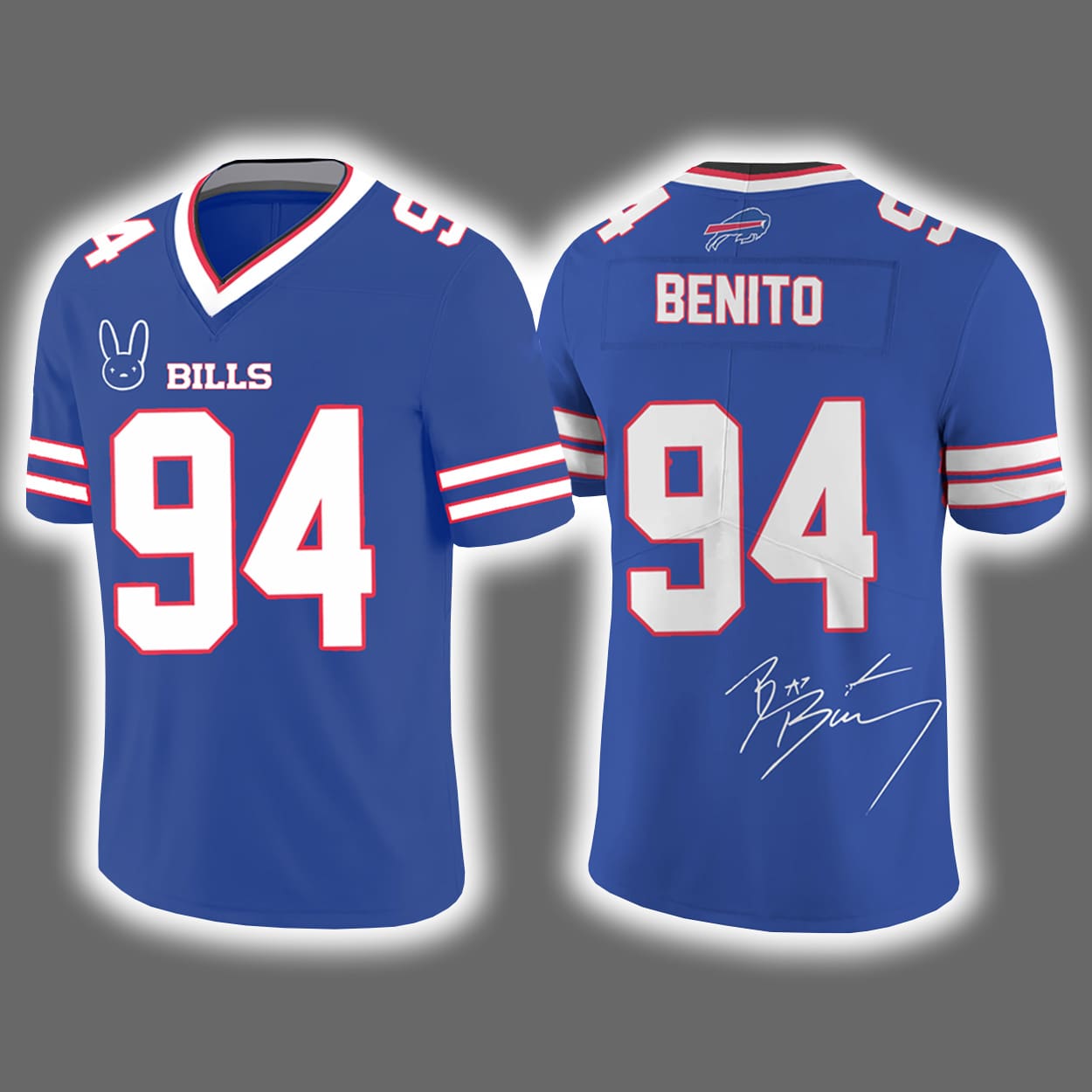 This isn’t your average football jersey—it’s a full-on fashion touchdown. The front rocks the number “94” in crisp white with a red outline, paired with “BILLS” across the chest and a cheeky white bunny logo that nods to Bad Bunny’s iconic. Turn it around and you’ll find “BENITO” boldly printed above the number, with a sleek white signature tucked beneath—like a backstage pass to the halftime show of the decade. Red and white sleeve stripes and a V-neck collar trimmed in team colors seal the deal, making this jersey a head-turner from every angle.