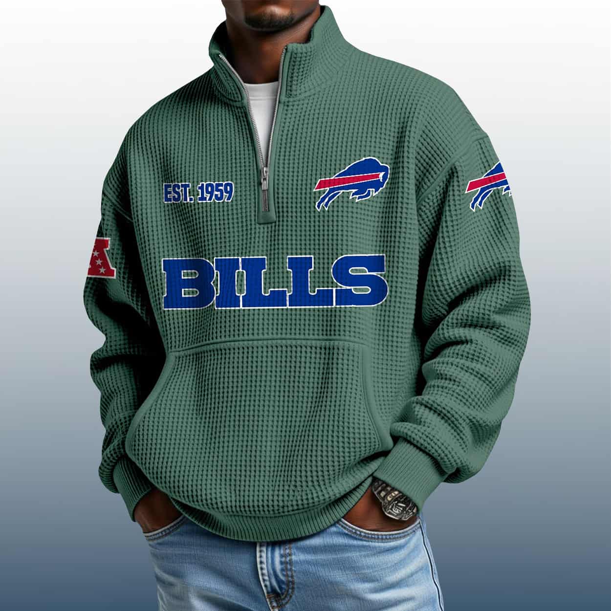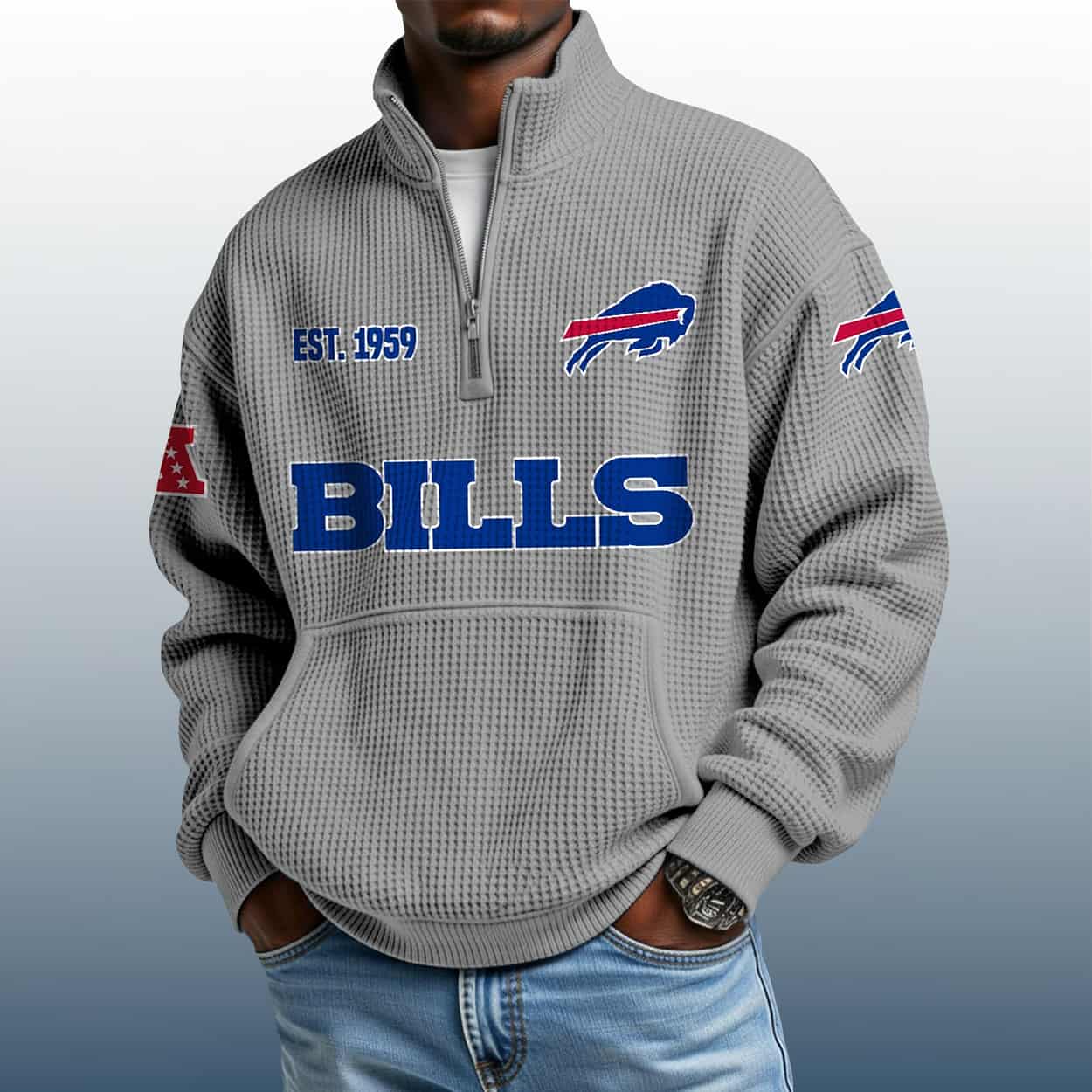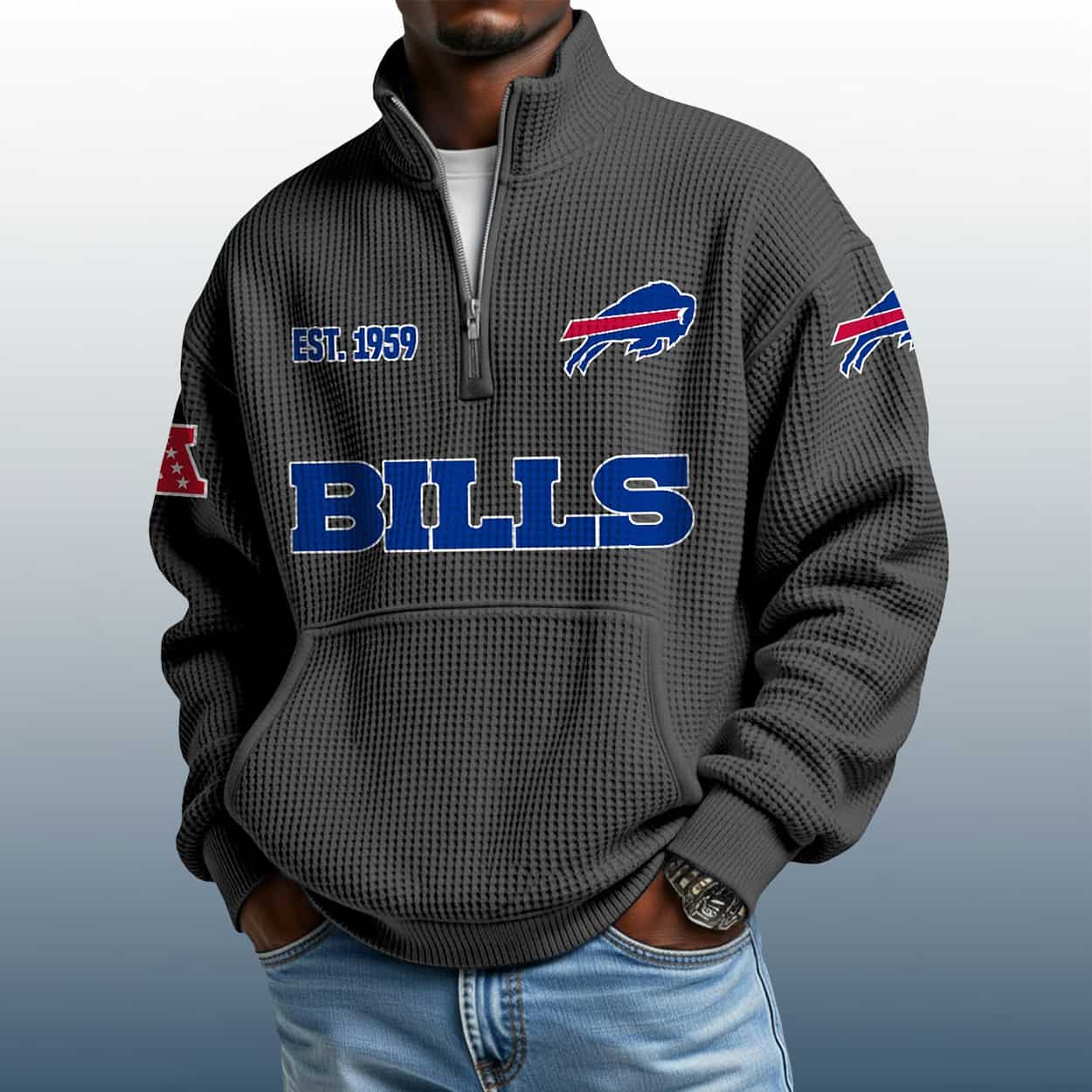 Step into game day—or any day—with this sweatshirt. This pullover is more than cozy; it’s a conversation starter. The textured waffle design adds depth and flair, while the stand collar and half-zip bring a sporty edge. Across the chest, “BILLS” shouts your allegiance in bold blue block letters. On the upper left, the iconic Bills logo sits proudly above “EST. 1959,” a nod to the team’s founding year. The right sleeve carries another Bills logo—because conference pride matters too.