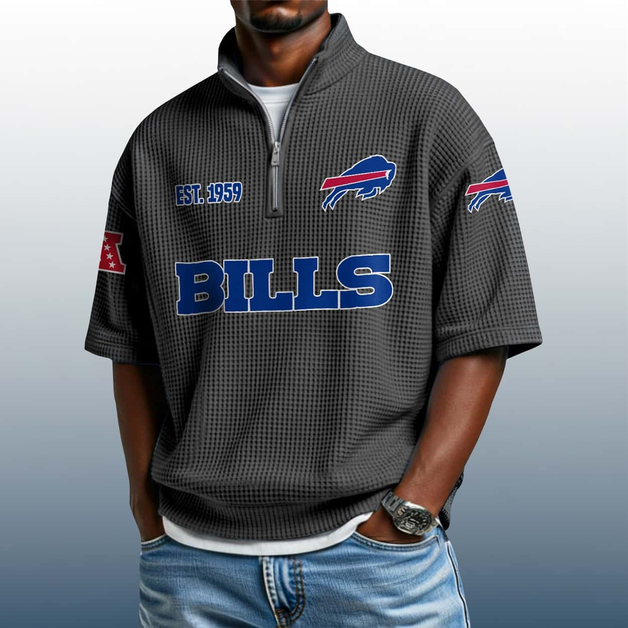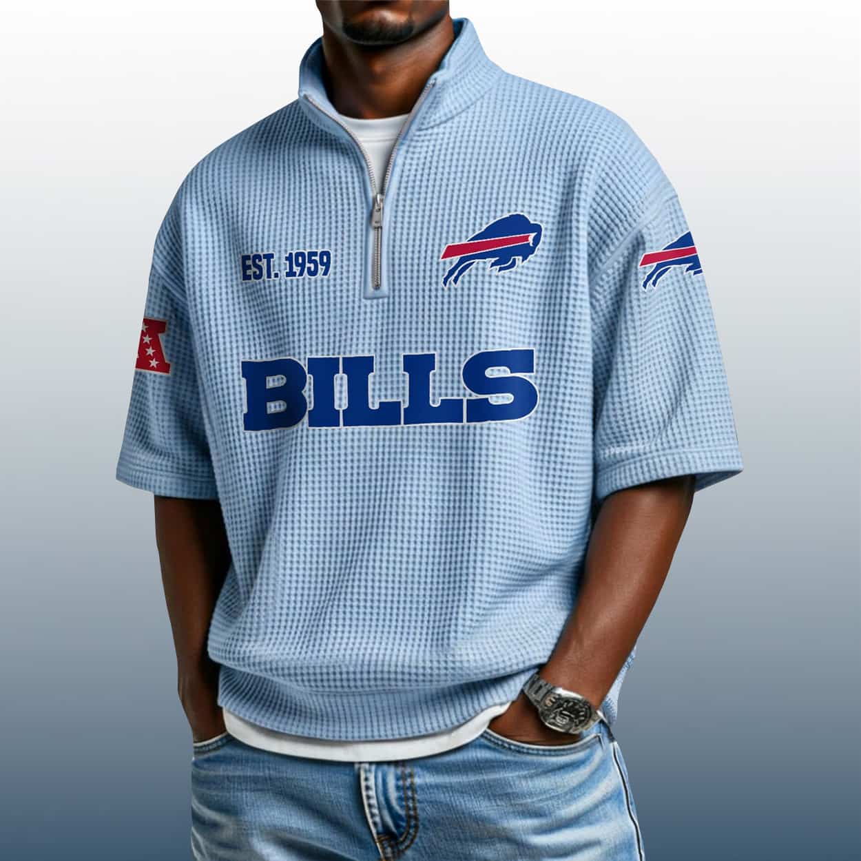 Gear Up in Gridiron Glory: The Bills Est 1959 Waffle Stand Collar Half Zip Polo Shirt