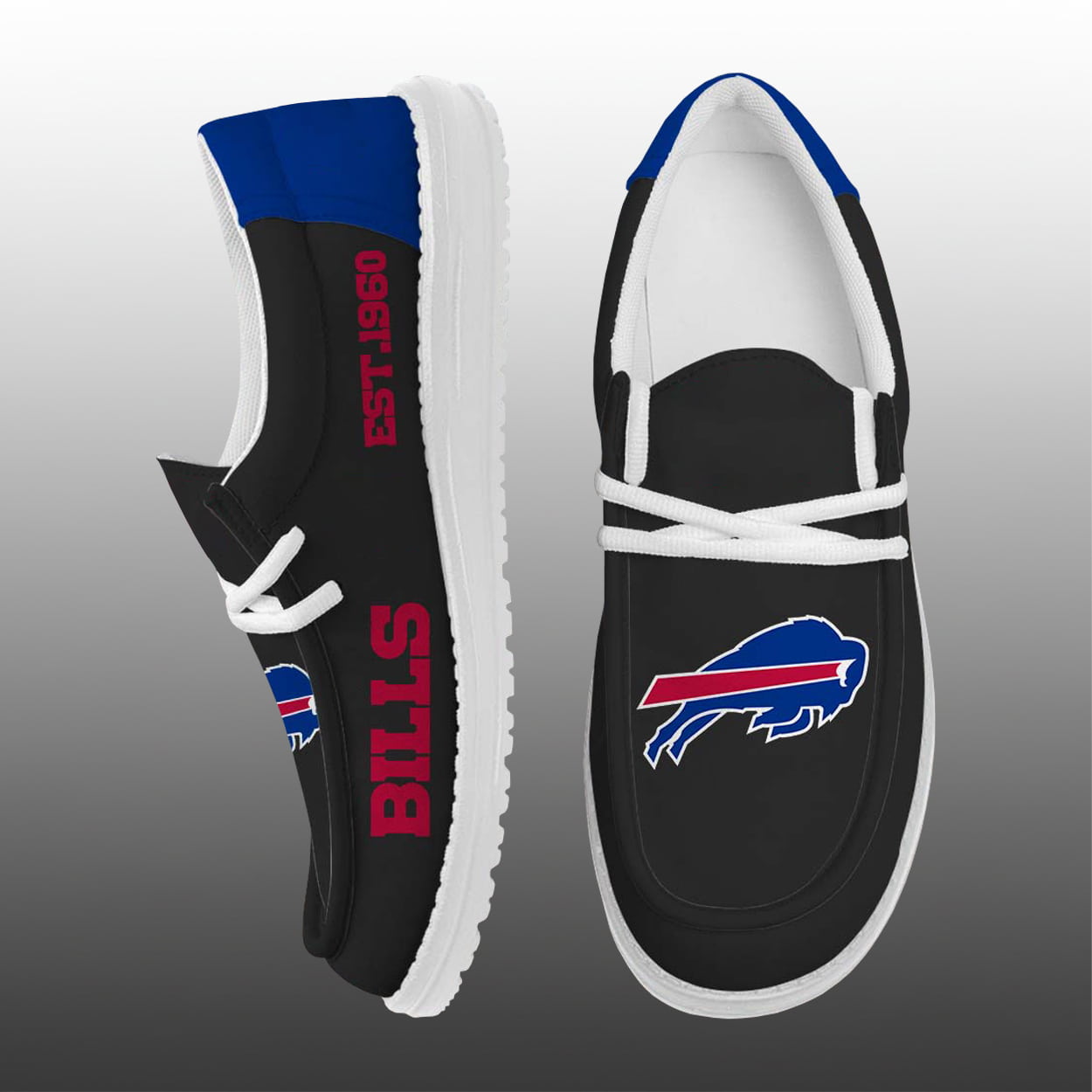 Lace up and let your fandom lead the way with this shoes. Drenched in the iconic blue of the Bills, these kicks are a touchdown in style. One shoe boldly spells out “BILLS” down the side, while “EST. 1960” near the ankle celebrates the team’s legendary birth year. The other shoe charges ahead with the unmistakable Bills logo—a red-streaked buffalo in motion, ready to stampede through any Sunday showdown. With crisp white laces and soles, plus red accents that pop like a game-day cheer, these shoes are a celebration of loyalty and legacy.
