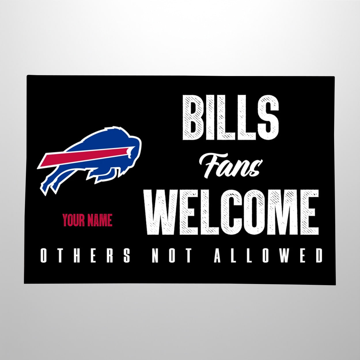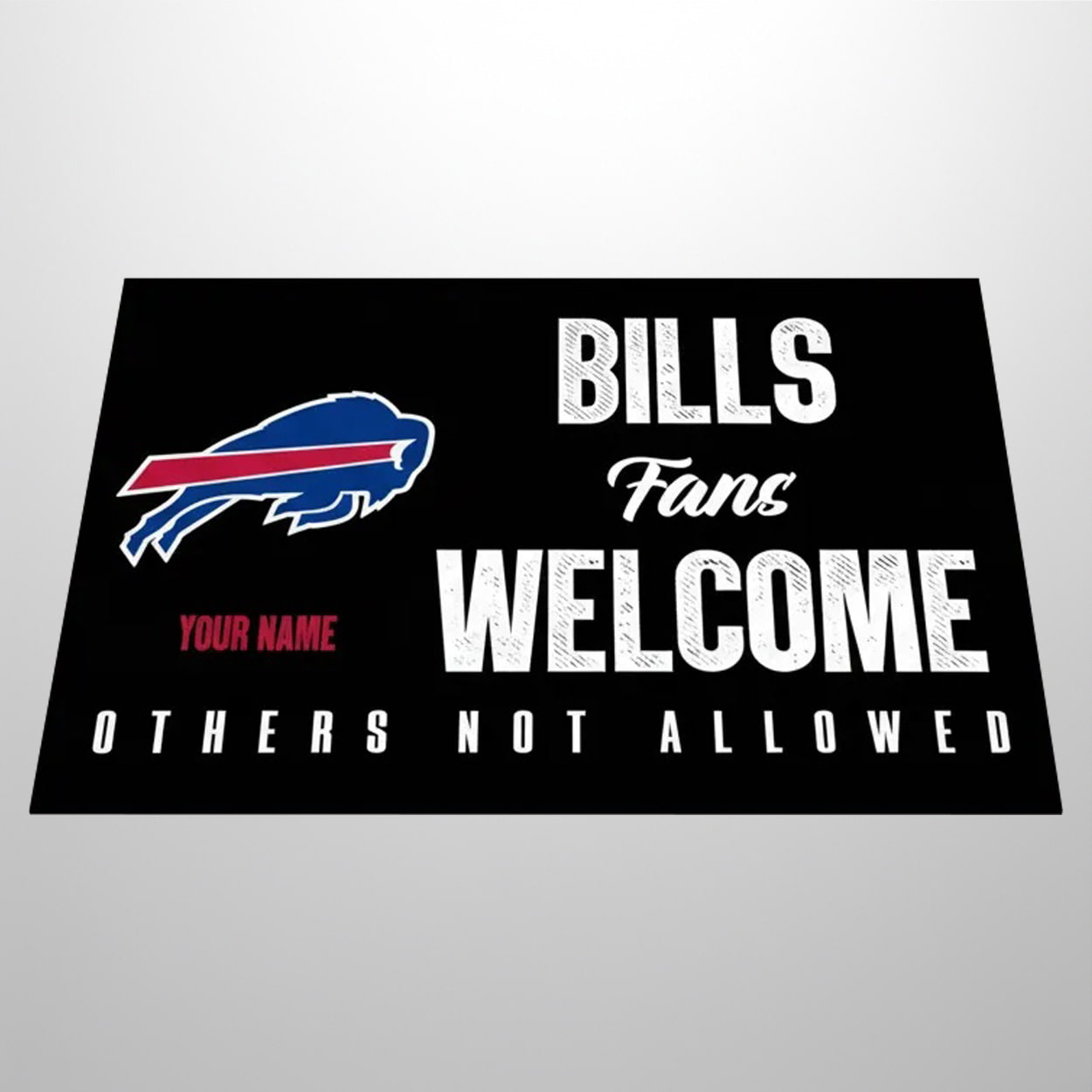 Step into the ultimate fan zone with this doormat. Featuring the iconic charging buffalo logo in vivid blue and red, this rectangular mat sets the tone before guests even knock. The phrase “YOUR NAME” in bold red lets you personalize your turf, while the unapologetic message below—“BILLS Fans WELCOME, OTHERS NOT ALLOWED”—makes it crystal clear: this is Bills territory. Whether placed at your front door, man cave, or tailgate setup, it’s a fun and fierce way to show team loyalty.