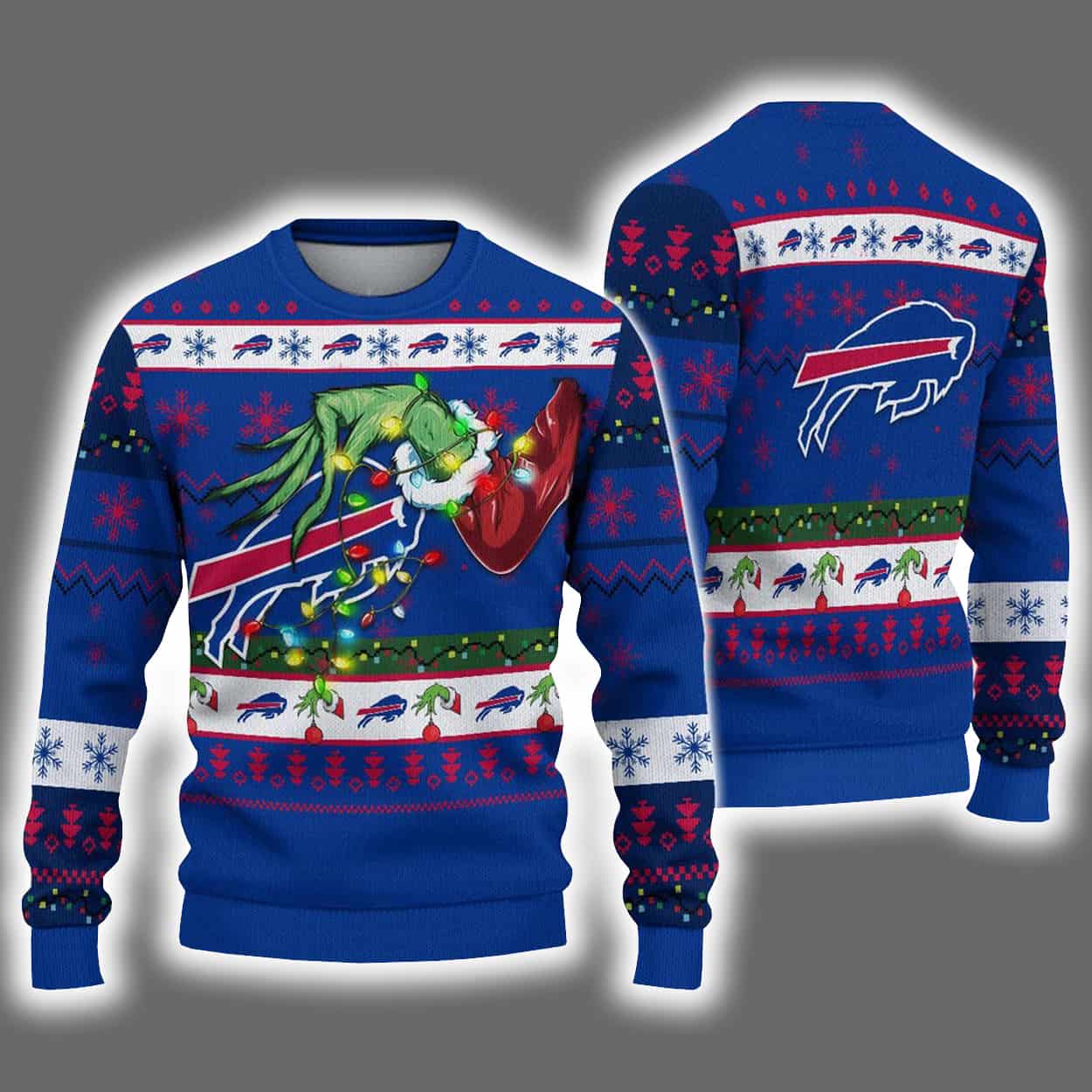 Deck yourself out in blue, red, and a touch of holiday mischief with this sweater. The front showcases the iconic Bills logo tangled in Christmas lights and ornaments, all being sneakily snatched by the Grinch’s green hand—because even he can’t resist the spirit of Bills football! Snowflakes, reindeer, and bold geometric patterns wrap the sweater in classic holiday charm, while the back mirrors the festive chaos with another proud display of the team logo. It’s a perfect blend of playful rebellion and team pride, designed to turn heads at every holiday party or game-day gathering.