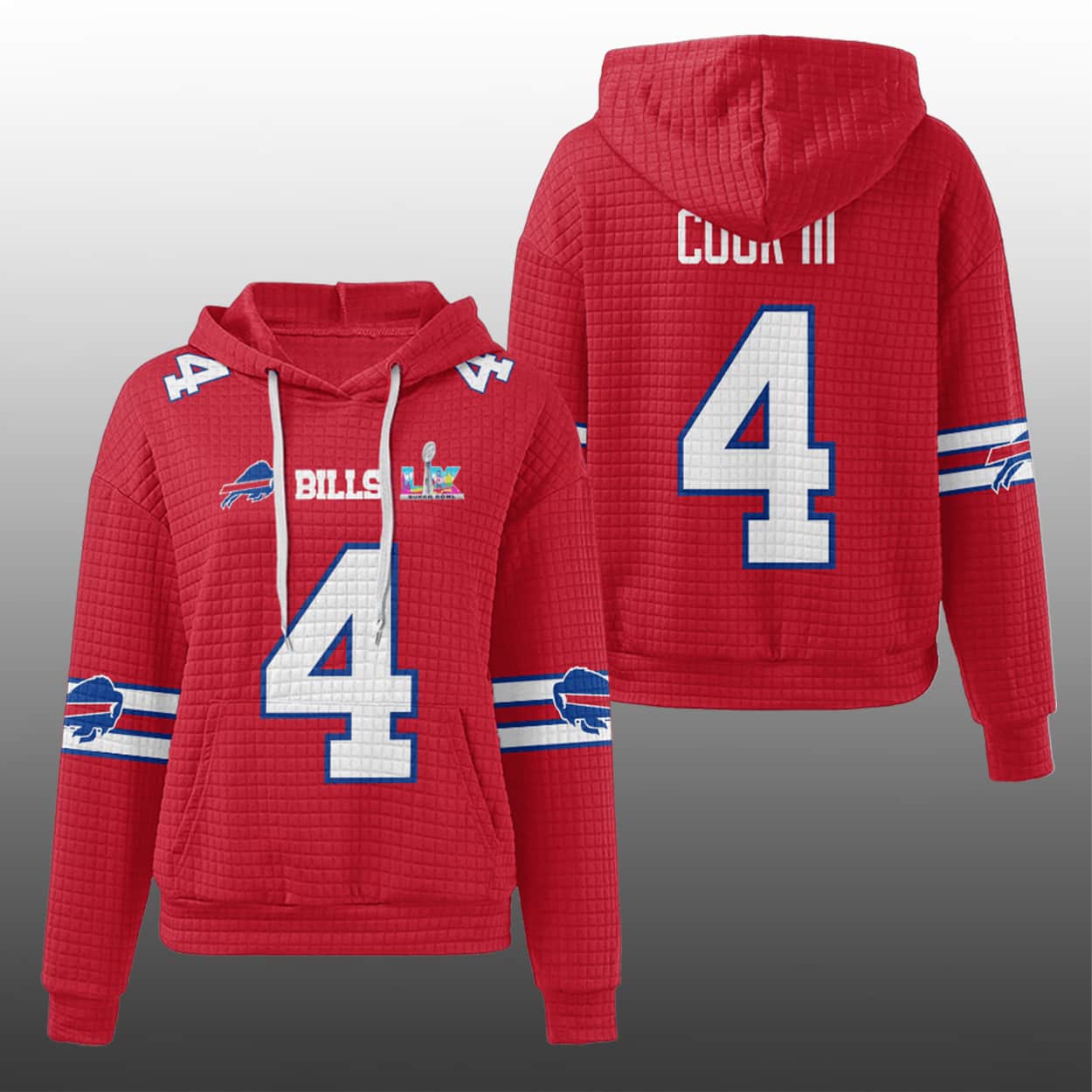 Turn heads and rep your team with the Bills James Cook III 4 SB LX Waffle Hoodie—where jersey vibes meet championship swagger.