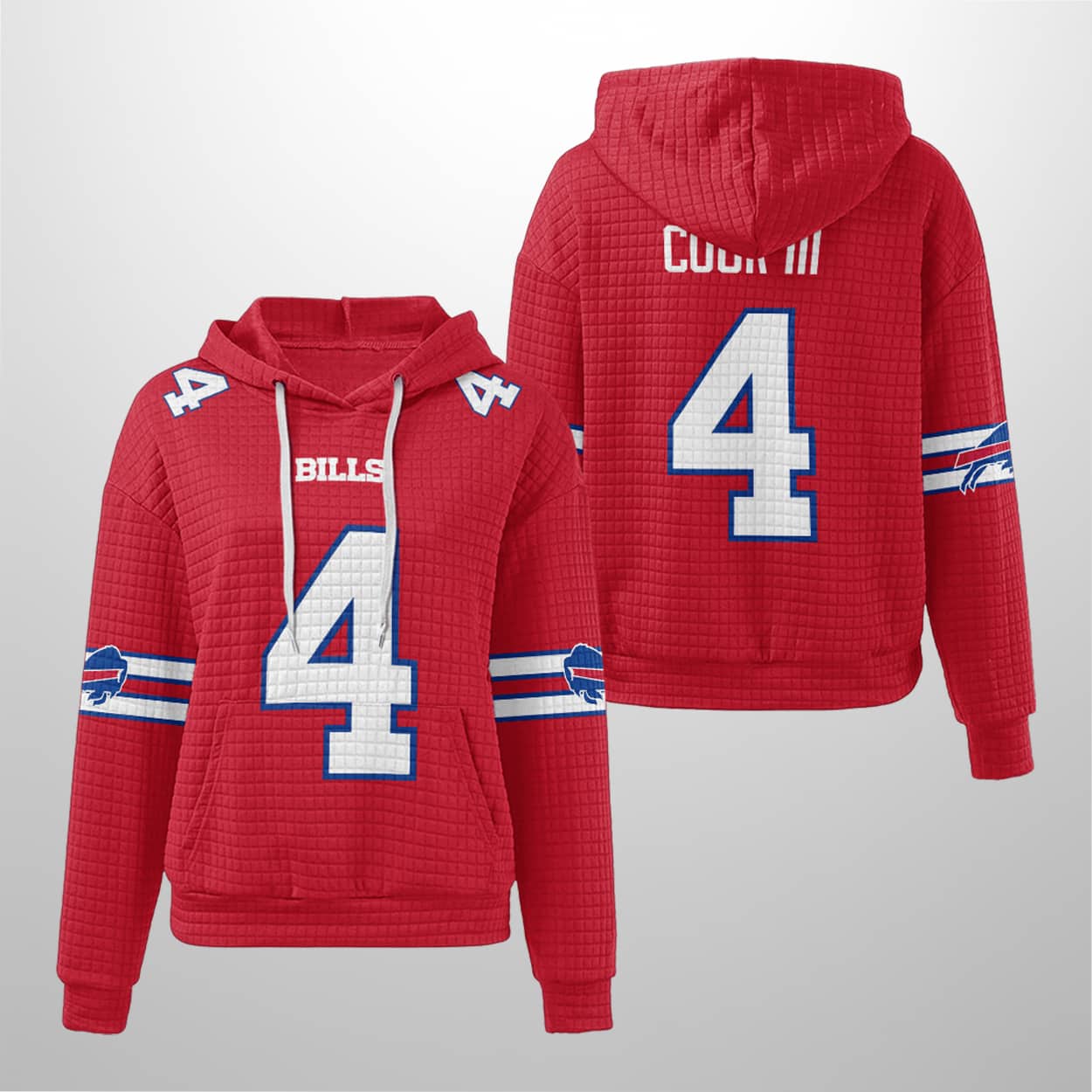 Celebrate your Bills pride with the Bills James Cook III 4 Waffle Hoodie—a bold blend of jersey flair and streetwear swagger. Perfect for fans who play hard and rep harder.