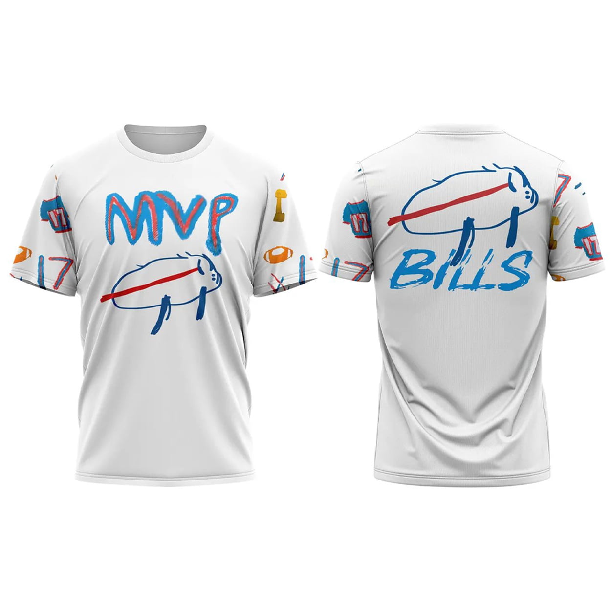 This shirt is a walking celebration of gridiron greatness. On the front, “MVP” bursts in electric blue and red lettering above a stylized buffalo logo streaking with red firepower—pure Josh Allen energy. Flip to the back and you’re greeted by a bold “BILLS” stamp in blue, anchored by the same charging buffalo. But the real party’s on the sleeves: footballs, the number “17,” and team-themed icons in red, blue, and yellow dance across each arm like confetti at a playoff win. It’s not just a shirt—it’s a full-on fan statement.