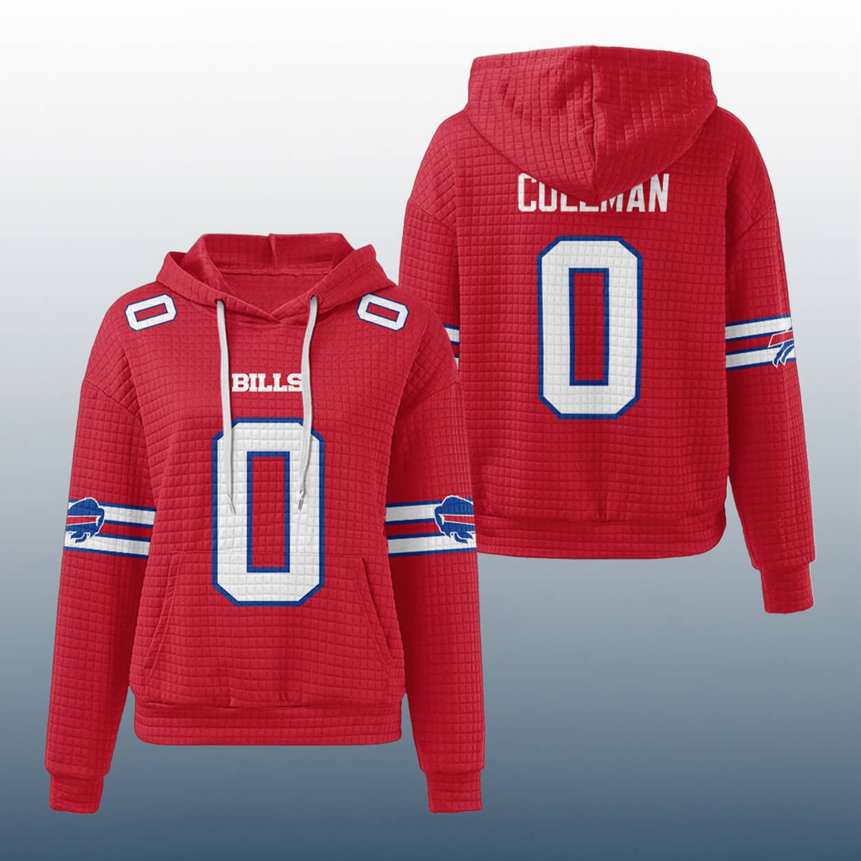 This hoodie is a fan-favorite fusion of football flair and everyday chill. With its textured waffle pattern and deep blue base, this hoodie brings the energy of the gridiron to your wardrobe. Across the chest, “BILLS” pops in crisp white, while the number “0” stands out in red and white—front and center. On the back, “COLEMAN” sits proudly above the same number, giving it that authentic jersey feel. Red and white sleeve stripes and Buffalo Bills logos, while the drawstring hood keeps things relaxed and ready for game day—or any day.