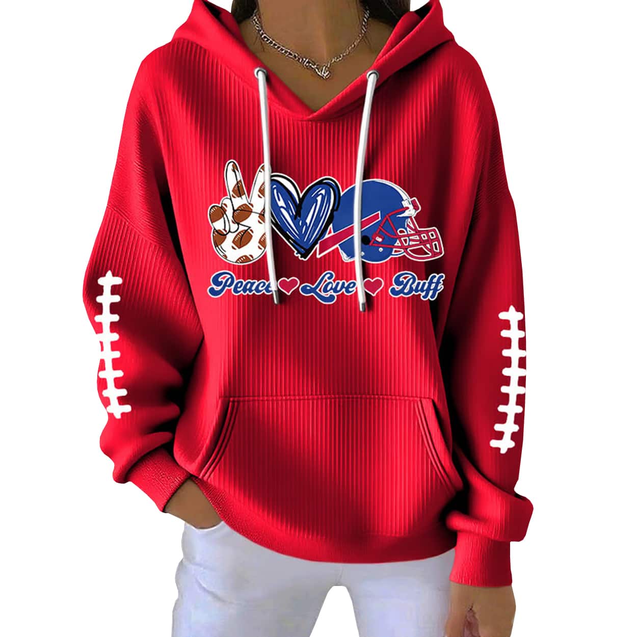 Turn heads and spark conversations with this hoodie. This vibrant red hoodie features white drawstrings and football lace striping down the sleeves, giving it a sporty edge. Front and center, three playful icons steal the show: a peace sign textured like a football, a heart filled with blue football stitching, and a classic blue helmet. Beneath them, the phrase “Peace ♥ Love ♥ Buff” ties it all together—because why settle for ordinary when you can wear your passion?