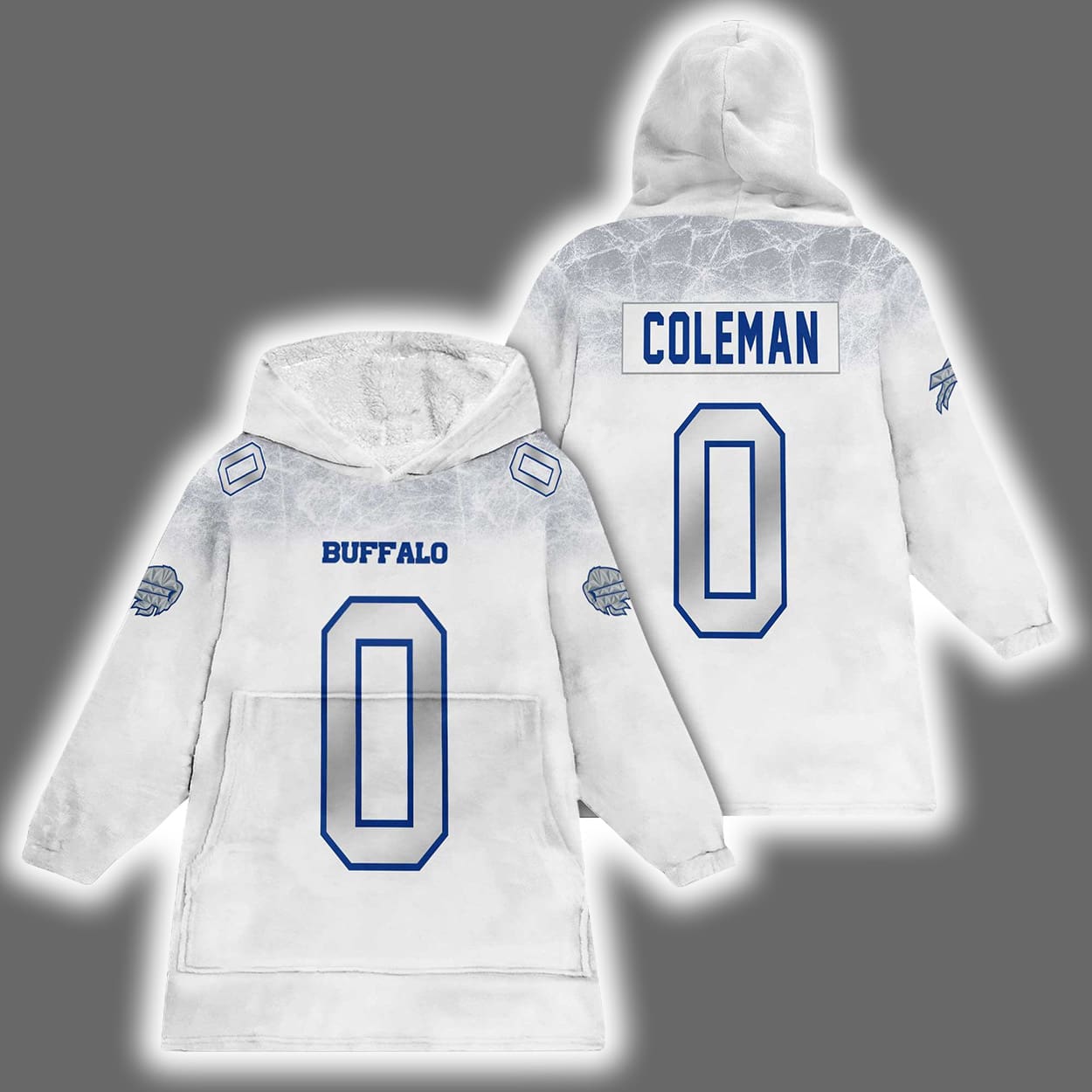 This hoodie is your go-to gear for game day chills and off-season thrills. Drenched in crisp white with electric blue accents, this hoodie wraps you in cozy confidence. The front boldly declares “BUFFALO” above a frosty blue number “0,” while the back showcases “COLEMAN” in matching icy lettering—making it clear who you’re backing. Shoulder and sleeve patches add a sporty edge, and the subtle frost patterns across the chest and hood bring winter vibes without the frostbite.