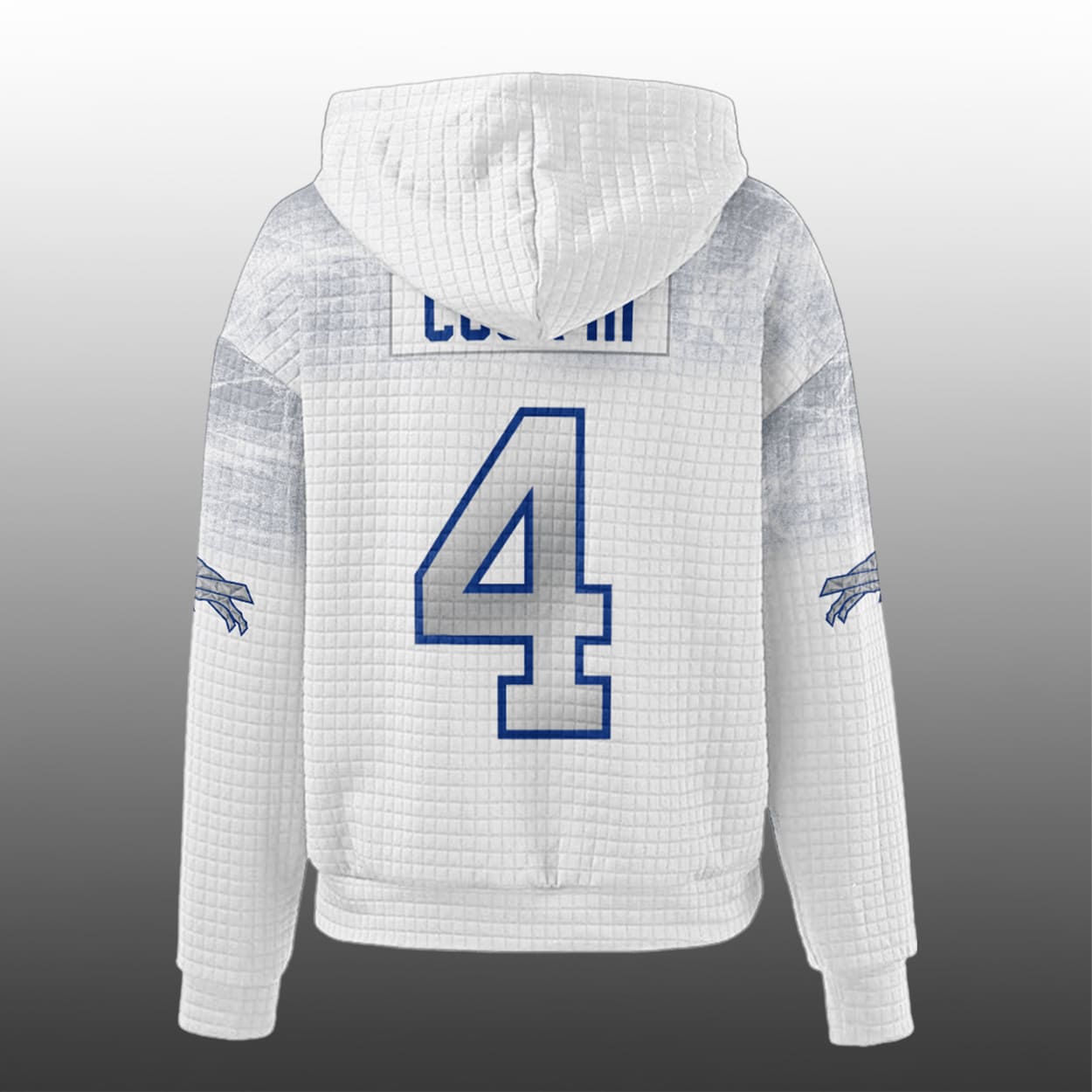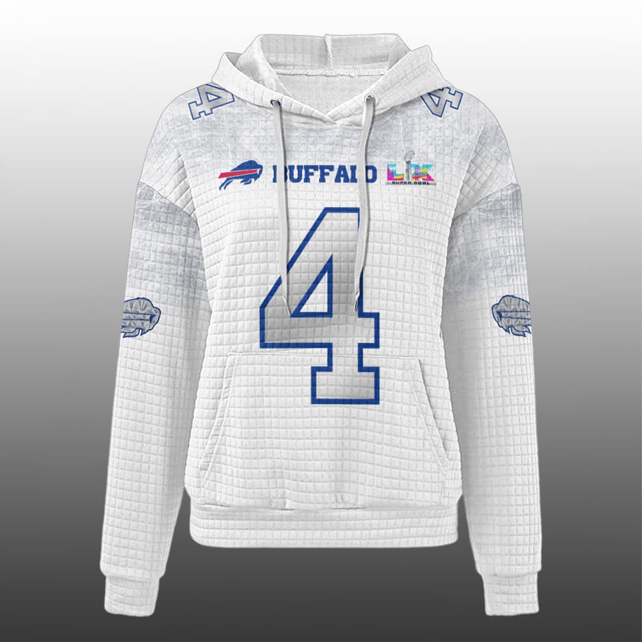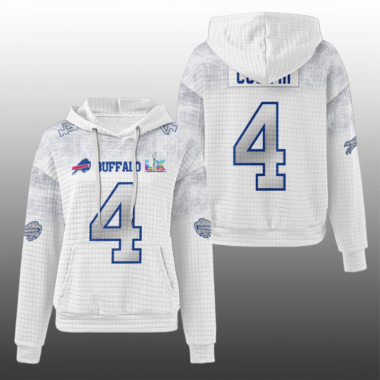 Step into the spotlight with this hoodie—a fan-favorite fusion of fierce style and football legacy. This hoodie features a textured grid pattern that adds depth and swagger. On the front, “BILLS” pops in bold blue and red above a commanding blue number “4,” while the iconic charging buffalo logo charges into view with unstoppable energy. Flip it around and you’ll find “COOK” proudly stamped above the same number, making it clear who you’re backing. The sleeves? They’re a celebration of rivalry and victory, decked out with team logos and SB LX that shout Bills pride from every angle.