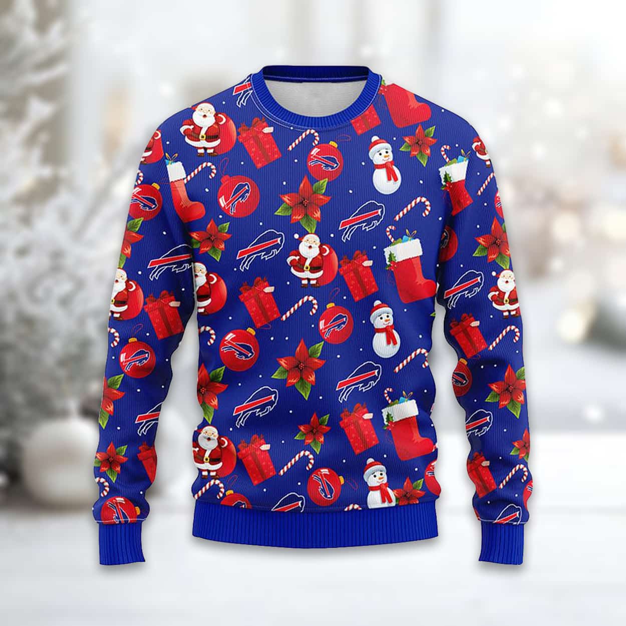 This sweater features a vibrant all-over print design, successfully merging classic Christmas imagery with Bills branding. The busy pattern includes the classic charging Buffalo logo, Santa figures, snowmen, wrapped gifts, and stockings, all utilizing the team’s blue, red, and white colors.
