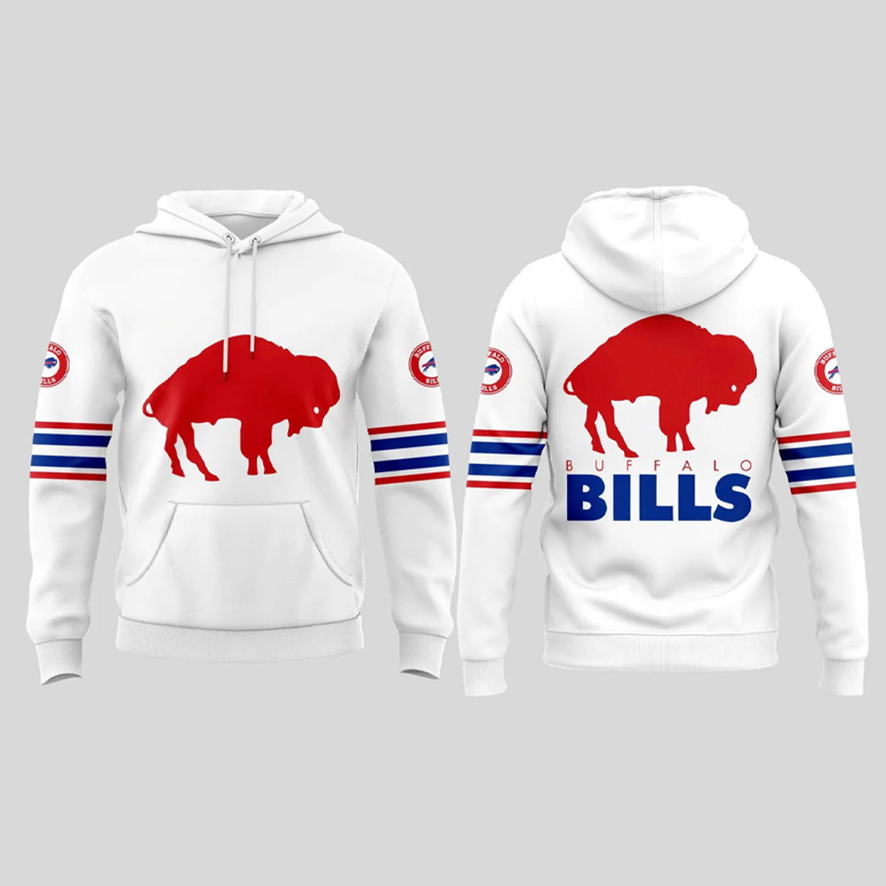Step into the season with the ultimate tribute to Buffalo grit. This head-to-toe combo includes a crisp white hoodie, joggers, and matching cap, each decked out in iconic team graphics. The hoodie showcases a bold red buffalo silhouette front and center, flanked by blue and red arm stripes and circular buffalo emblems on the sleeves. The back keeps the energy alive with the same red buffalo above the proud “BILLS” text in bold blue. The joggers echo the hoodie’s clean lines and team colors, while the cap ties it all together with a classic fit and matching buffalo logo. It’s a full look that screams loyalty and legacy.