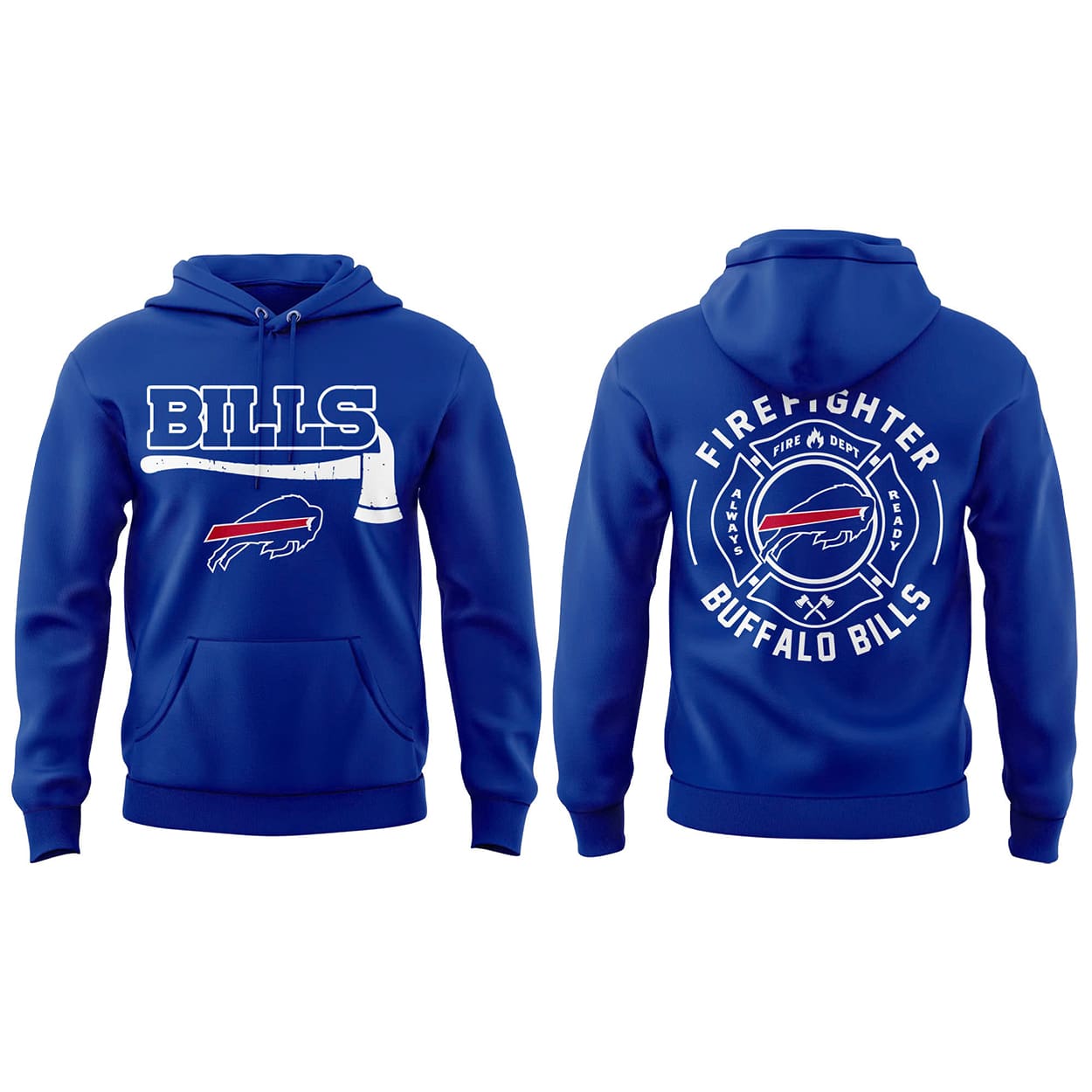 This isn’t just fan gear—it’s a full-on tribute to courage and team spirit. The hoodie leads the charge in bold blue, with “BILLS” emblazoned across the chest in crisp white. Just below, the charging buffalo logo surges forward beside a white firefighter helmet—because this team doesn’t just play hard, it honors hard work. On the back, a circular emblem proudly reads “FIREFIGHTER” and “BUFFALO BILLS,” wrapped around a fire department symbol featuring axes, a helmet, and the Bills logo at its heart. The words “FIRE DEPT,” “ALWAYS,” and “READY” complete the tribute.