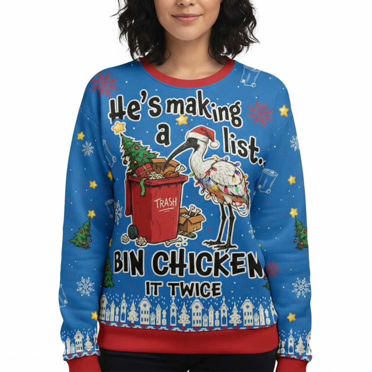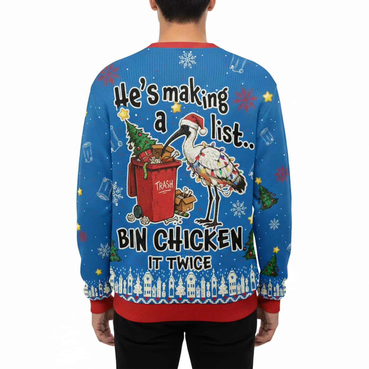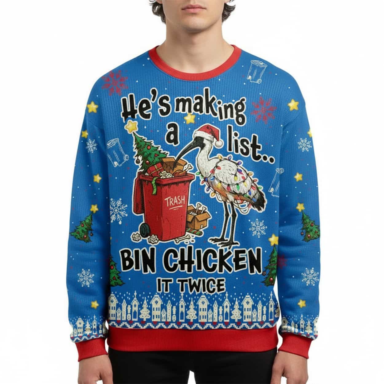 Celebrate the holidays with cheeky Aussie flair in the Bin Chicken It Twice Ugly Christmas Sweater—where festive meets funny in the most unforgettable way.