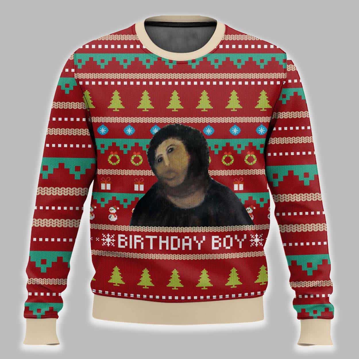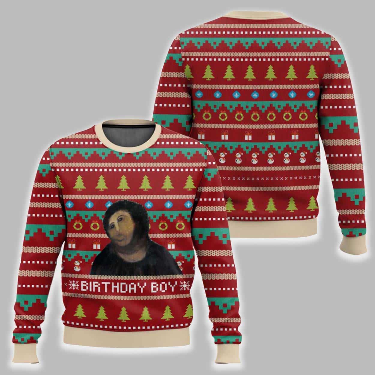 This sweater is a brilliant celebration of one of the most famous art restoration fails and internet memes of all time. It hilariously takes the “Potato Jesus” image and places it in the context of Christmas, playfully referencing Jesus as the “Birthday Boy.” This is the ultimate holiday apparel for the meme enthusiast, the art history buff (with a great sense of humor), or anyone looking for a truly unique, conversation-starting, and slightly absurd ugly Christmas sweater.